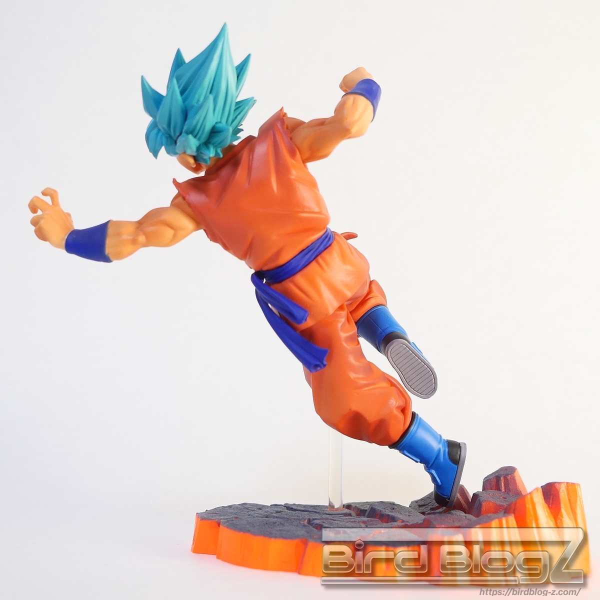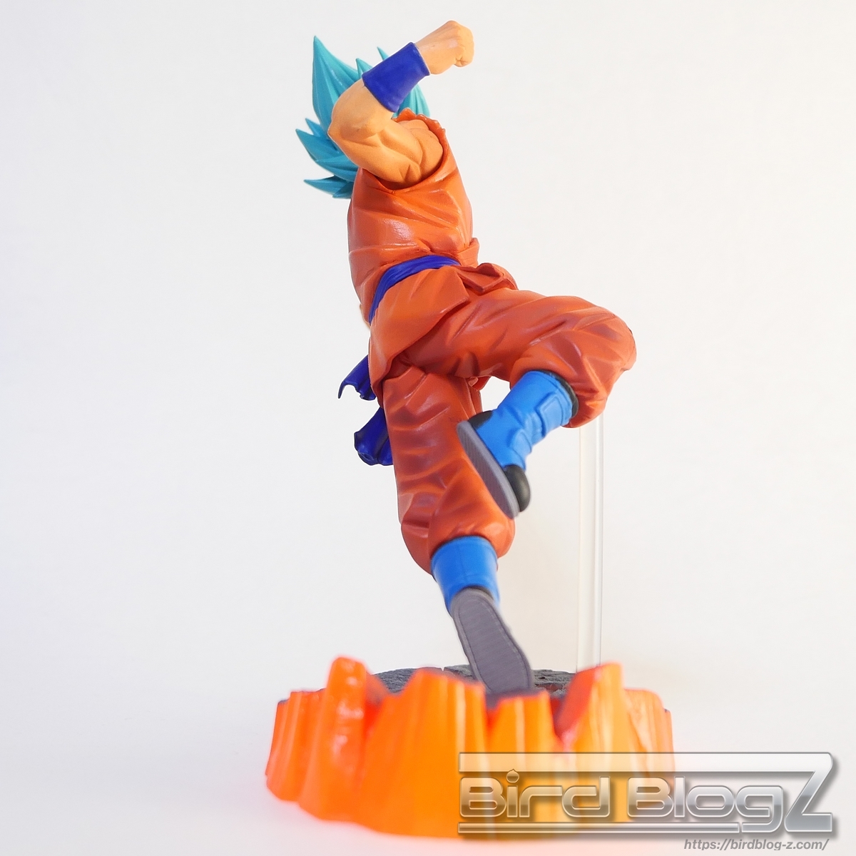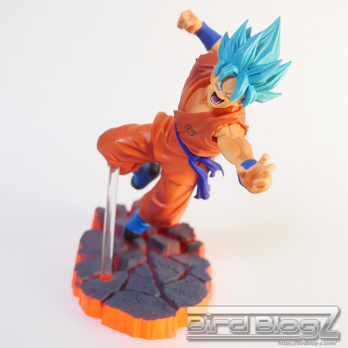 勢いよく地面を蹴り上げて立ち向かう姿は力強く感じます。ジオラマ台座は砕ける地面に塗装が吹きつけがあります。唇と歯茎が離れて表情に違和感を感じます。本体サイズは小さいですが、指先や道着の破れなど細かく造形されています。