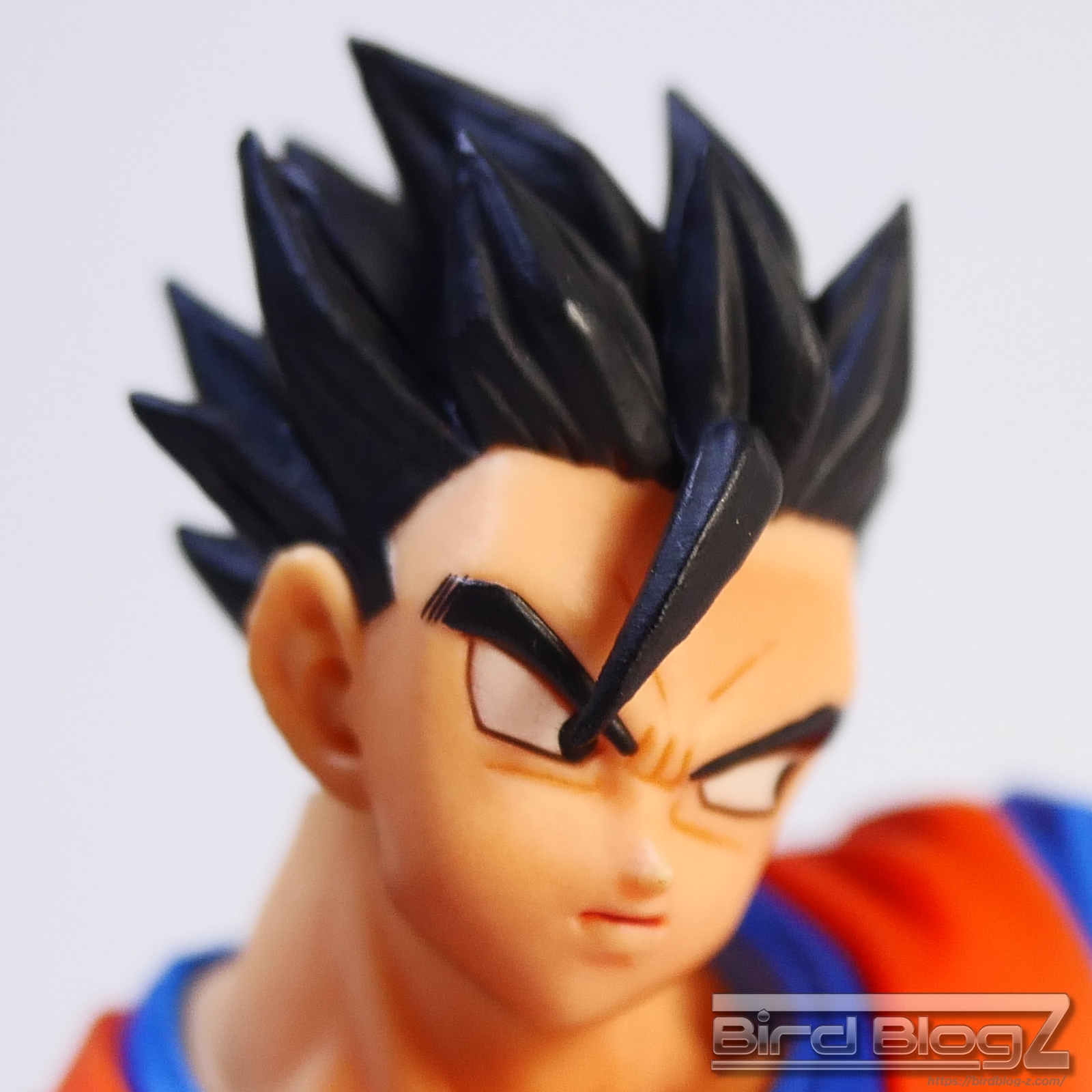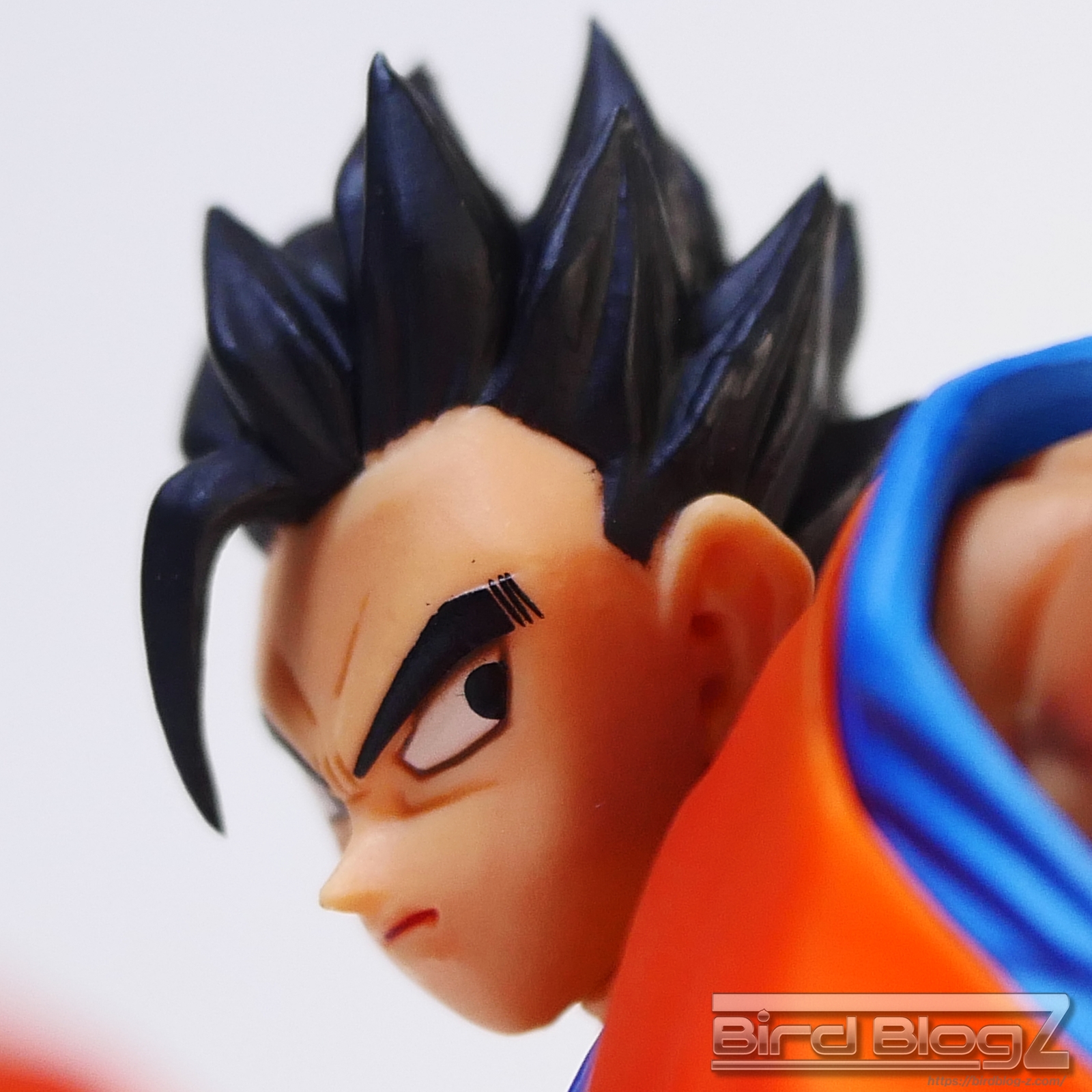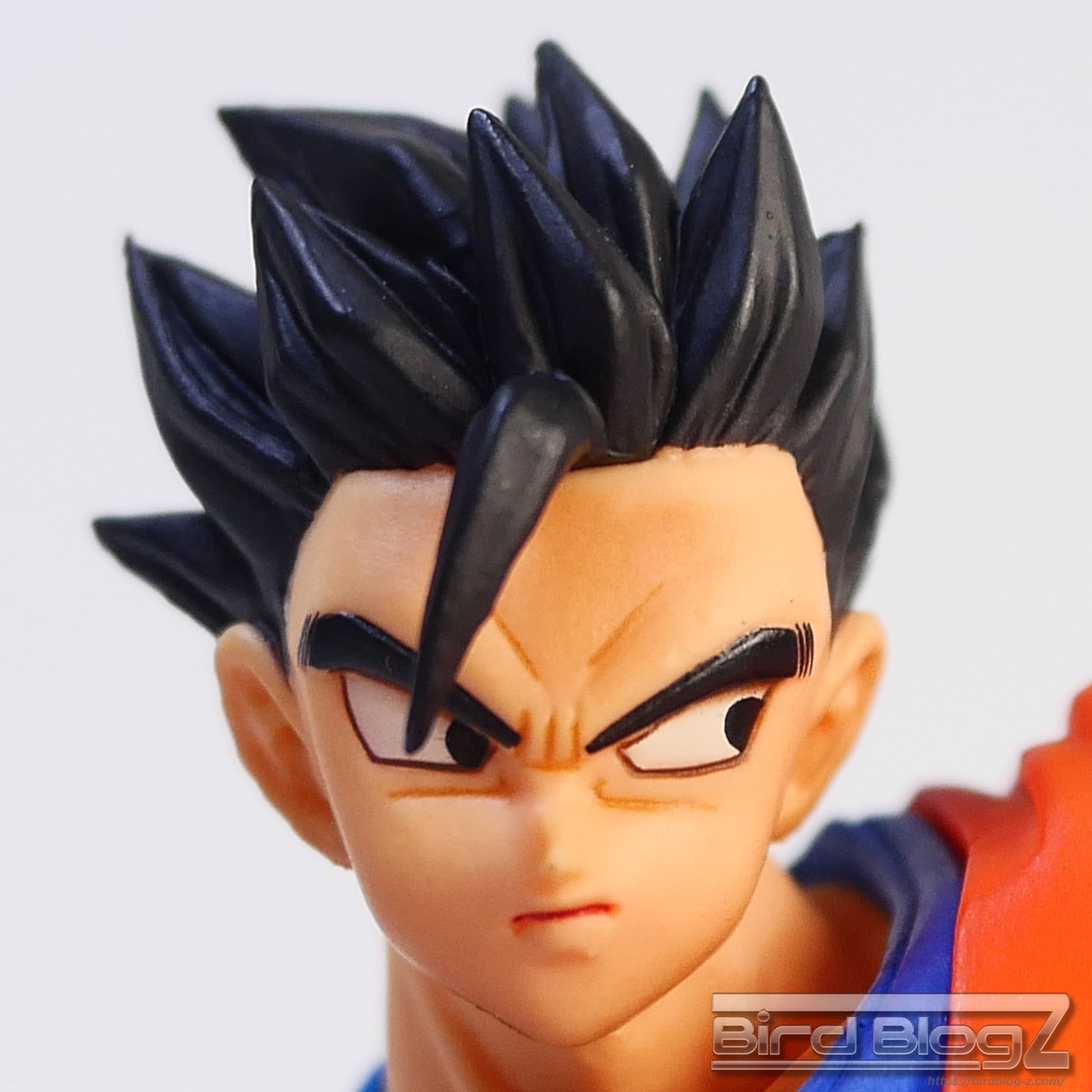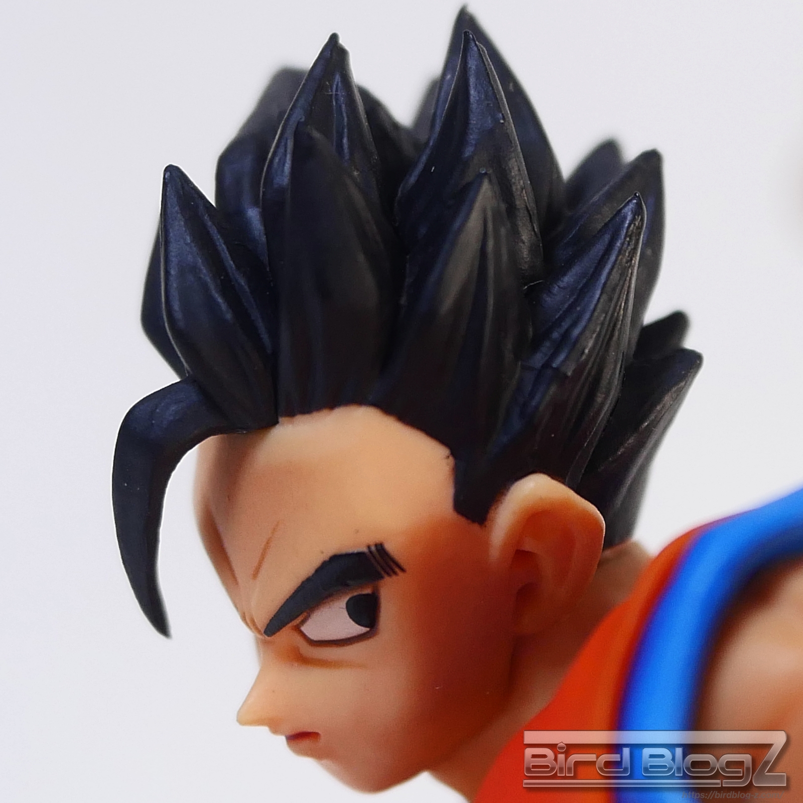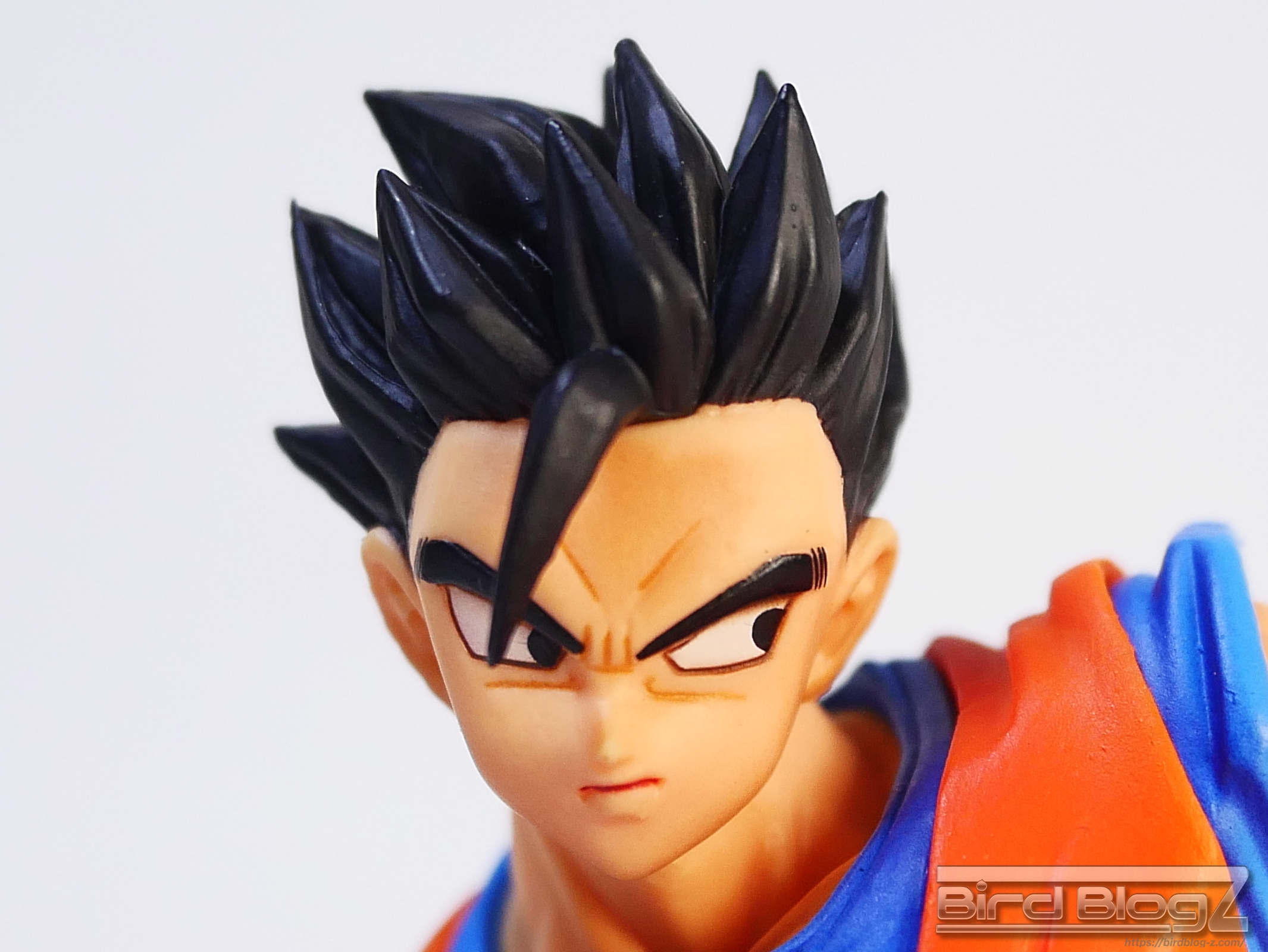 直線的な眉と白目の大きさ、鼻の角度等が孫悟飯の表情がしっかりと再現されています。ショートヘアーが蹴りの動きに合わせて髪も動く造形があります。シェーディングの陰影が入り正面がはっきりとします。