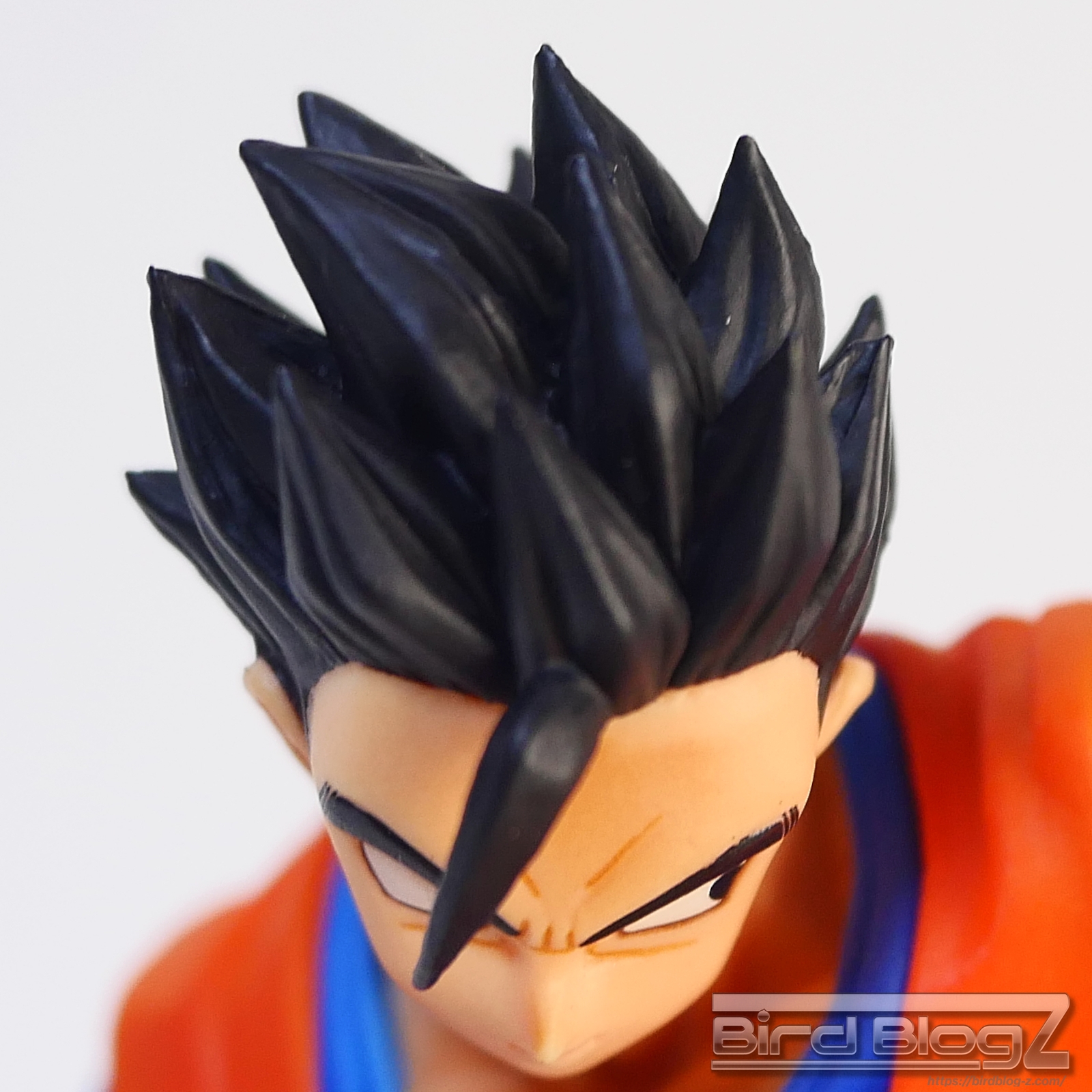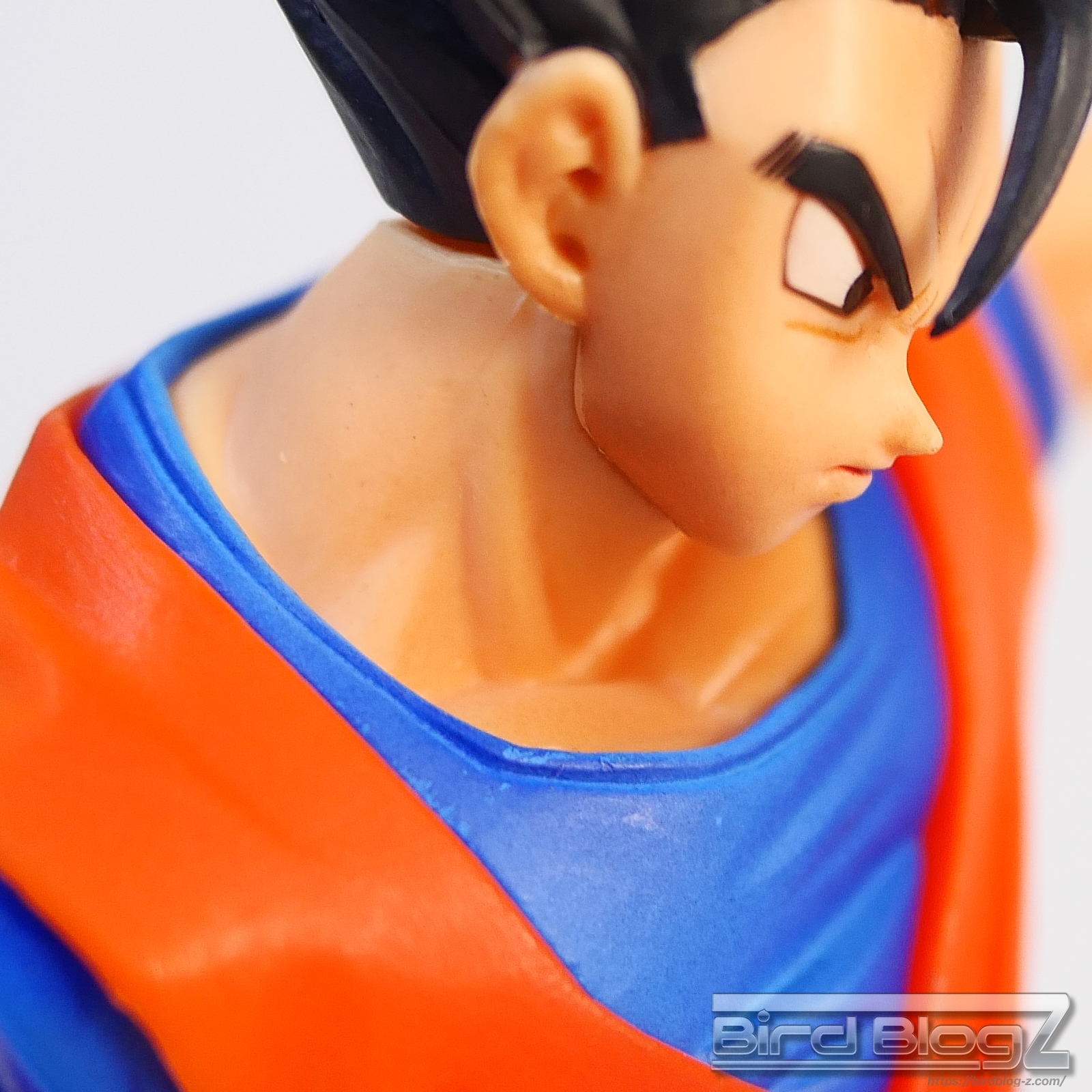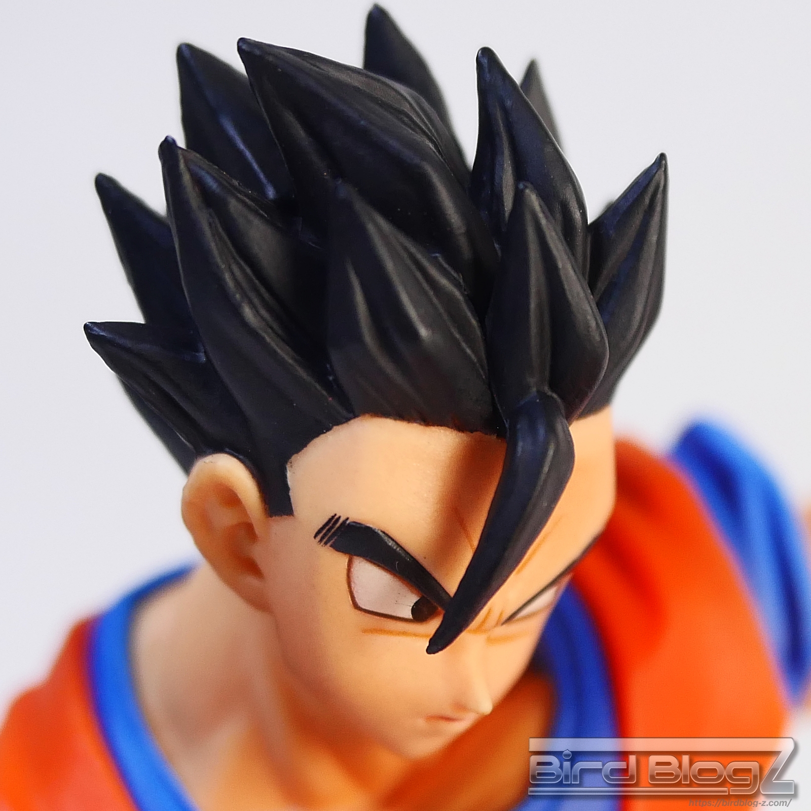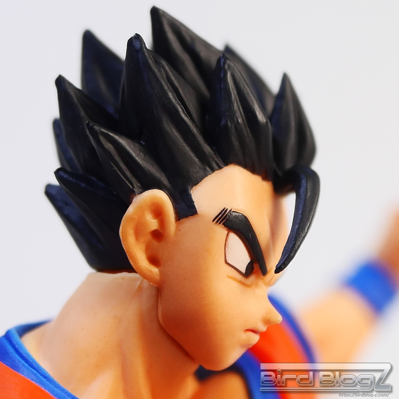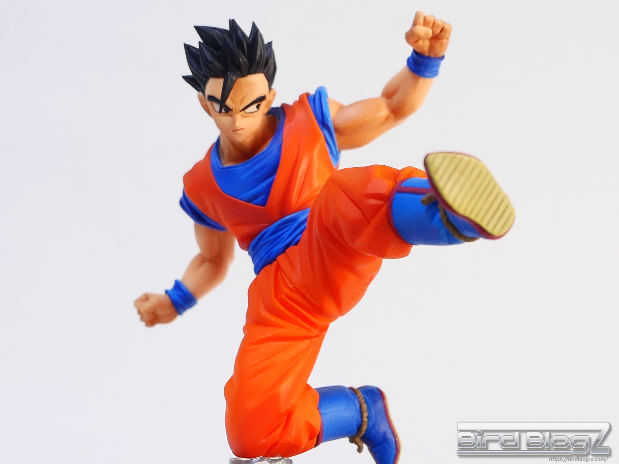 直線的な眉と白目の大きさ、鼻の角度等が孫悟飯の表情がしっかりと再現されています。ショートヘアーが蹴りの動きに合わせて髪も動く造形があります。シェーディングの陰影が入り正面がはっきりとします。