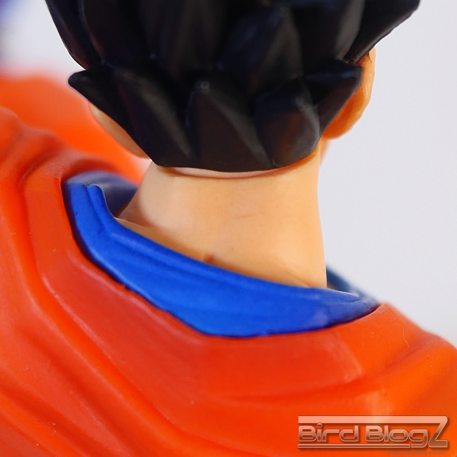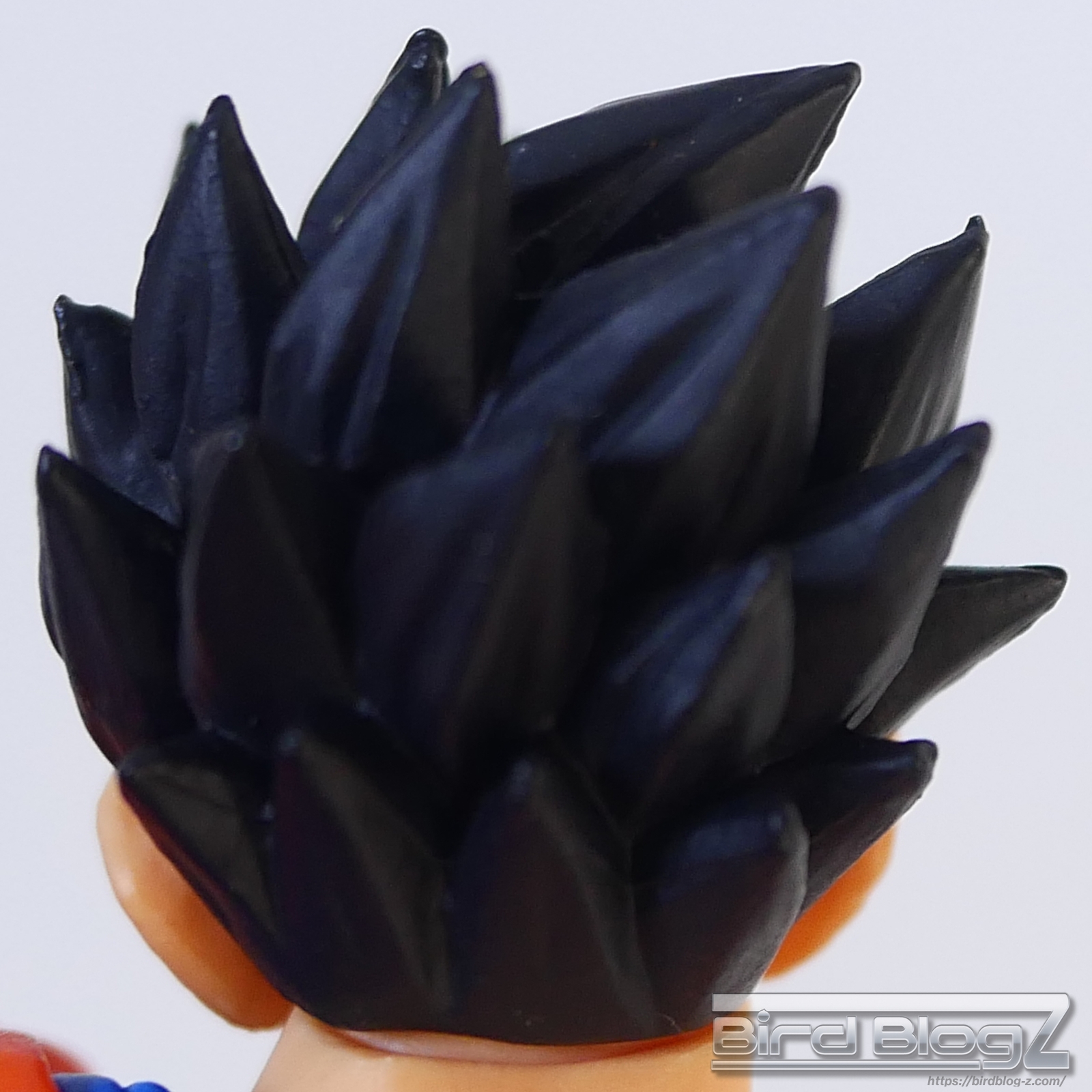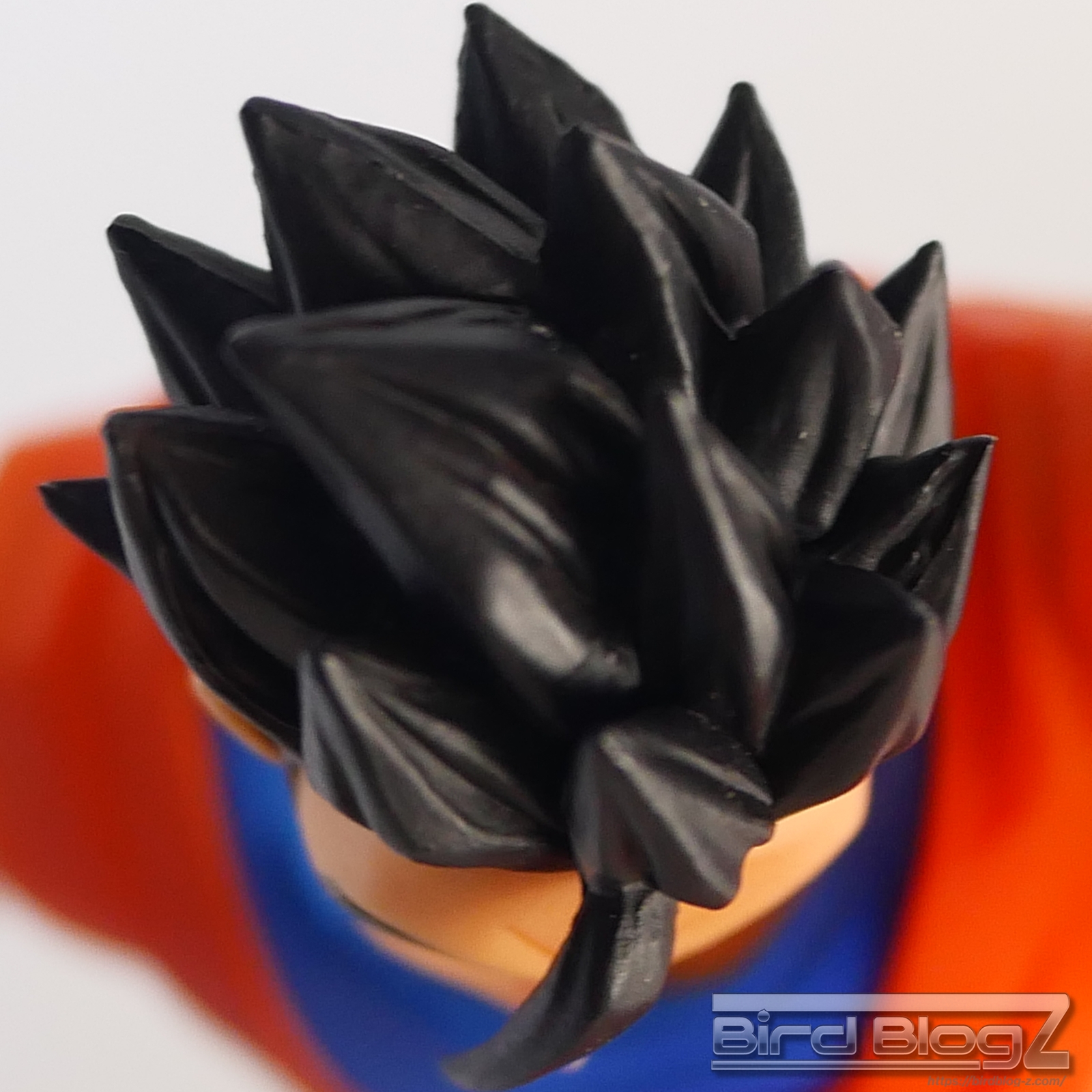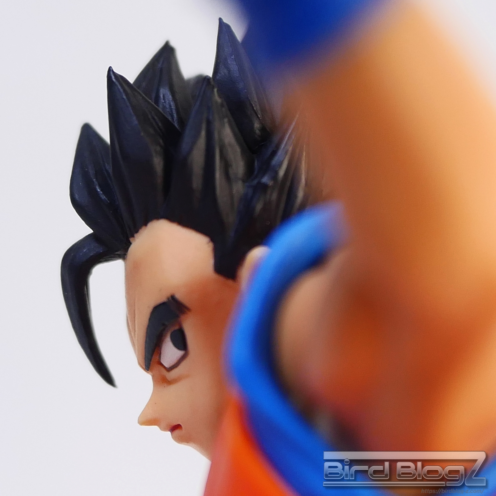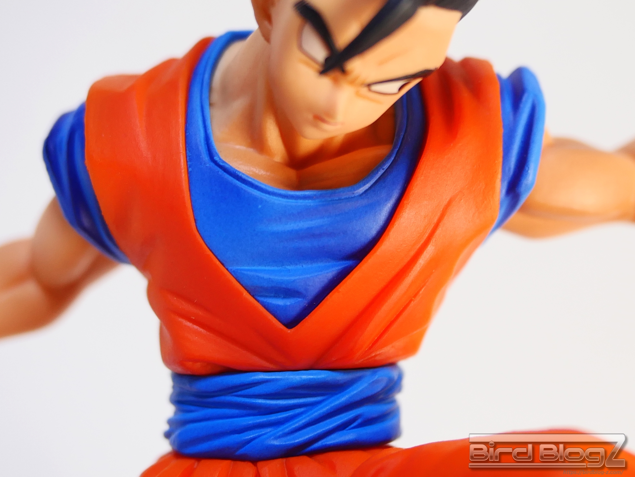 直線的な眉と白目の大きさ、鼻の角度等が孫悟飯の表情がしっかりと再現されています。ショートヘアーが蹴りの動きに合わせて髪も動く造形があります。シェーディングの陰影が入り正面がはっきりとします。