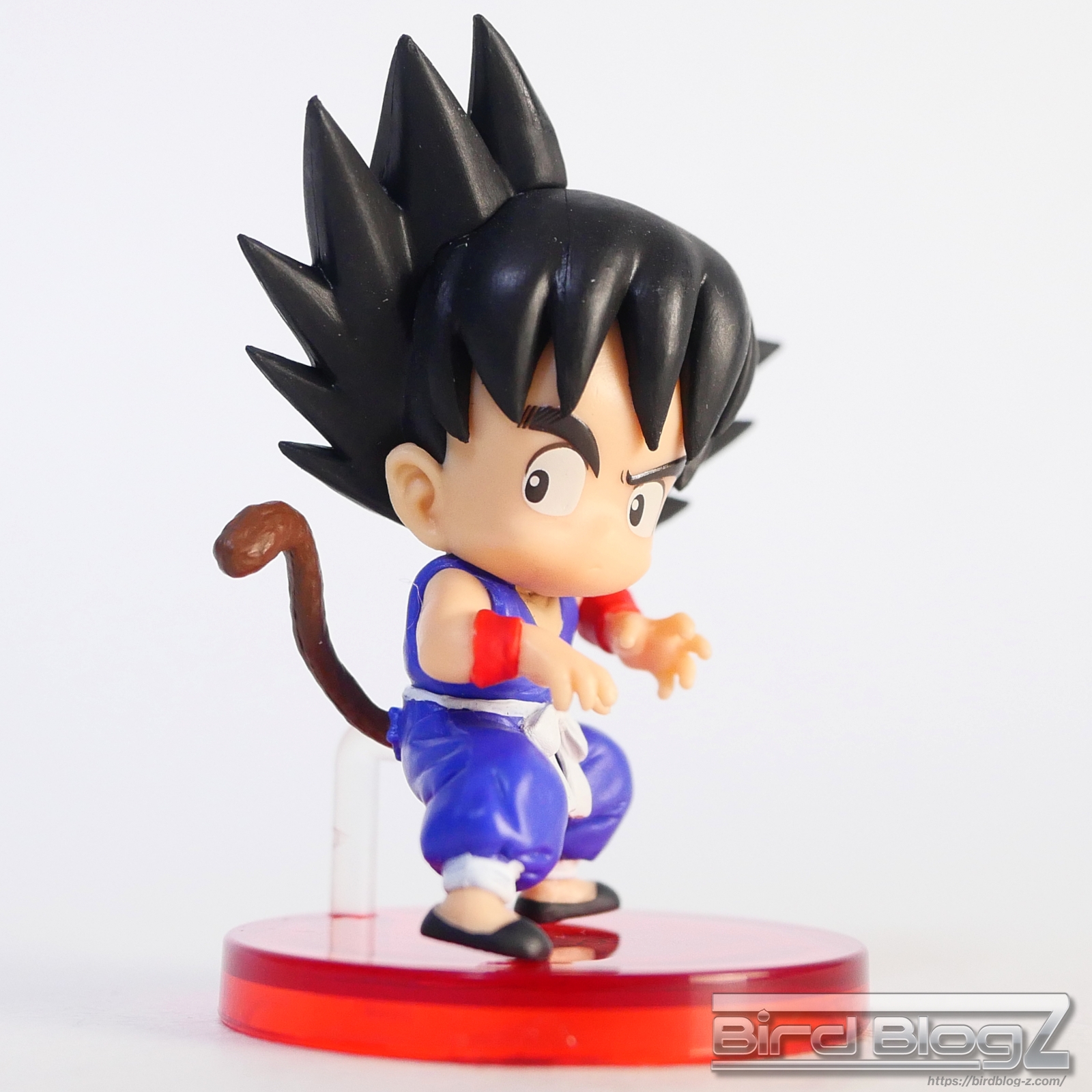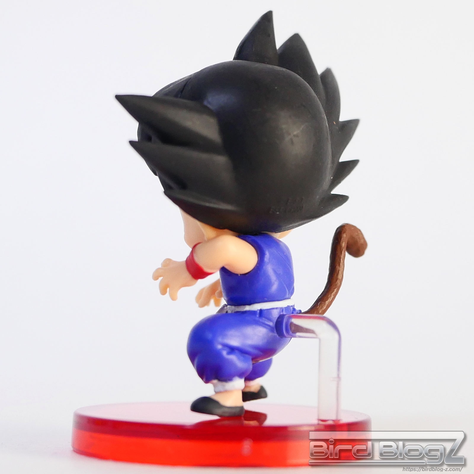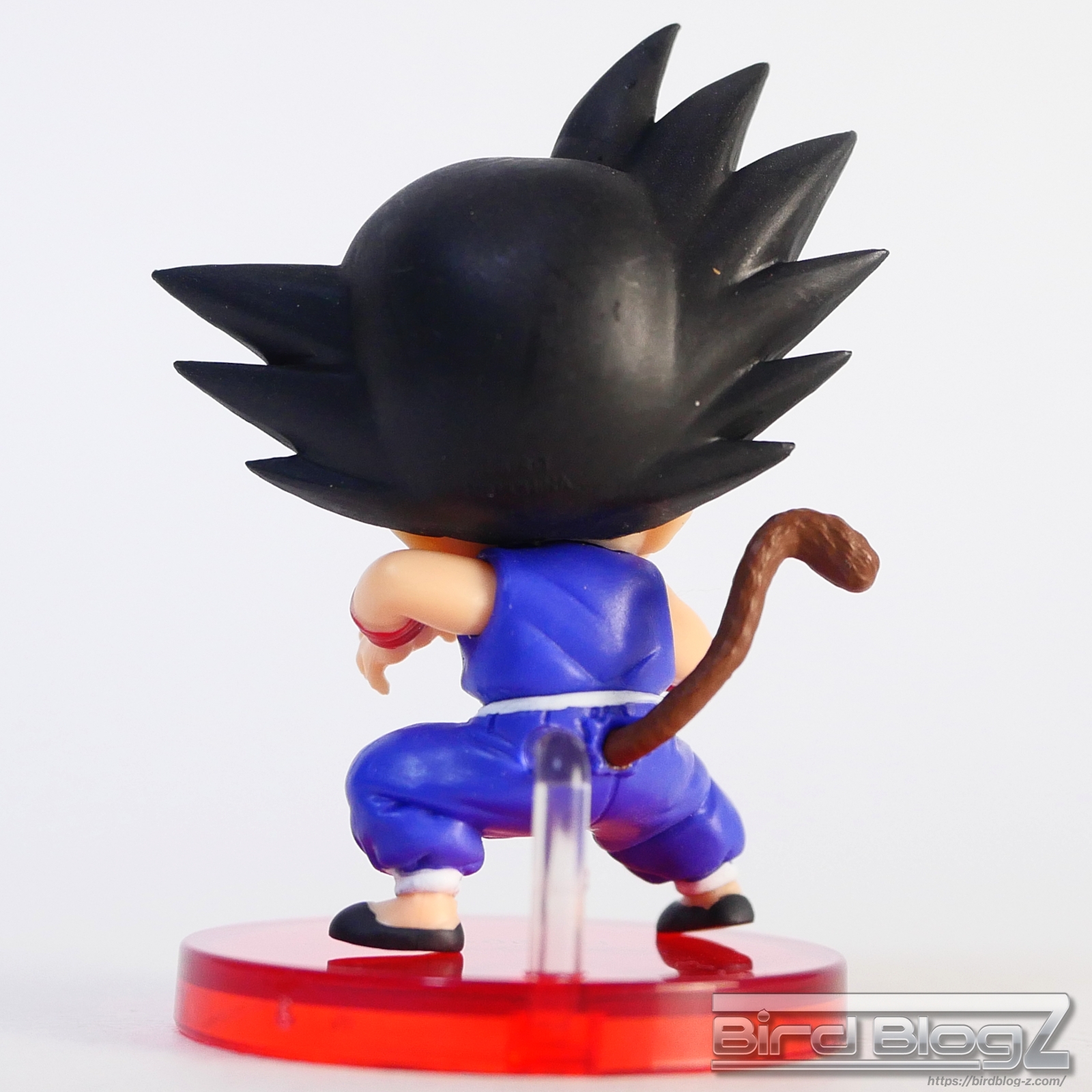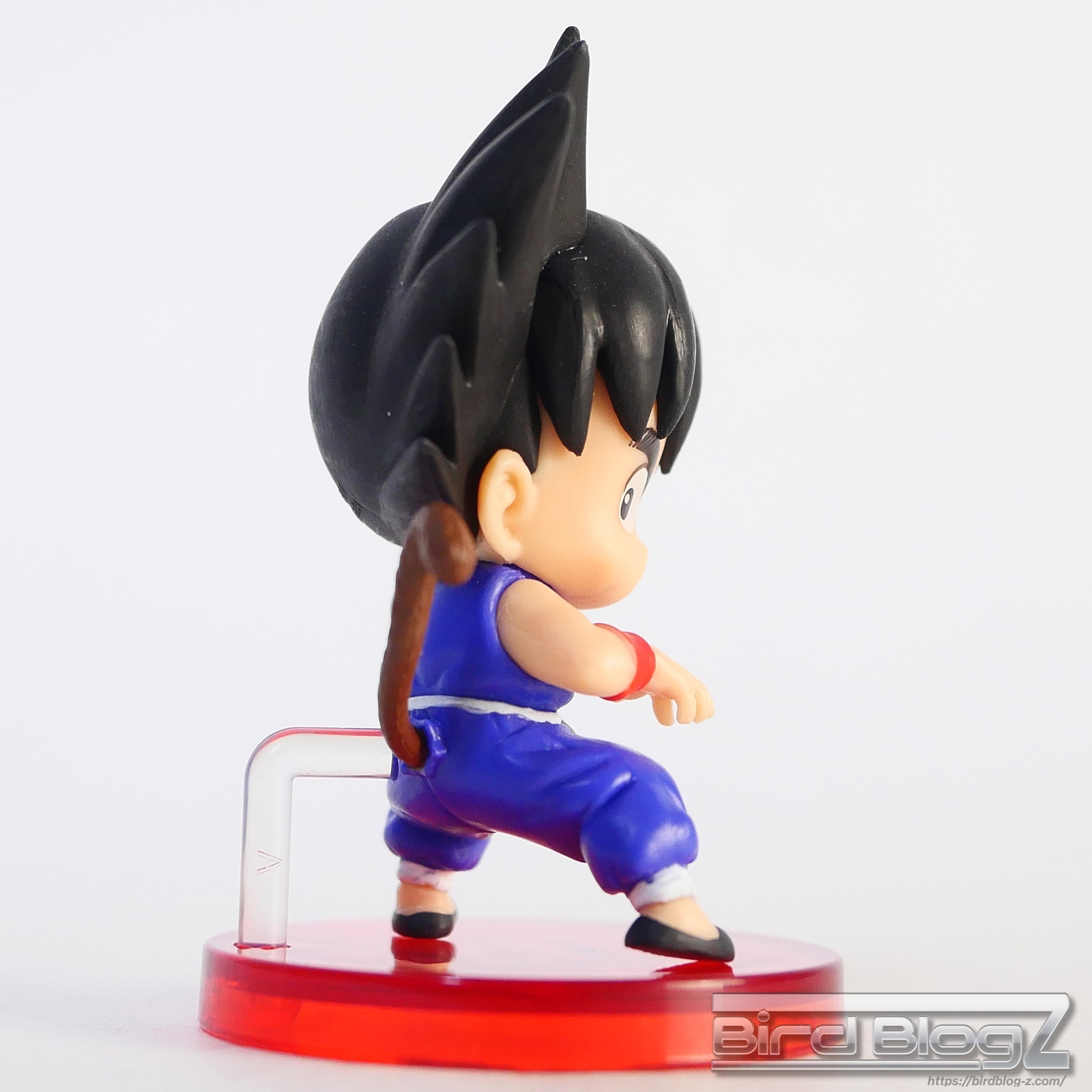 「む~むんむん・・・・・・・・・・」と薪割り前の構えポーズが造形。青紫の初期道着衣服が着用。道着の尻尾箇所は破れ造形があります。手、足を短くディフォルメされてかわいいです。
