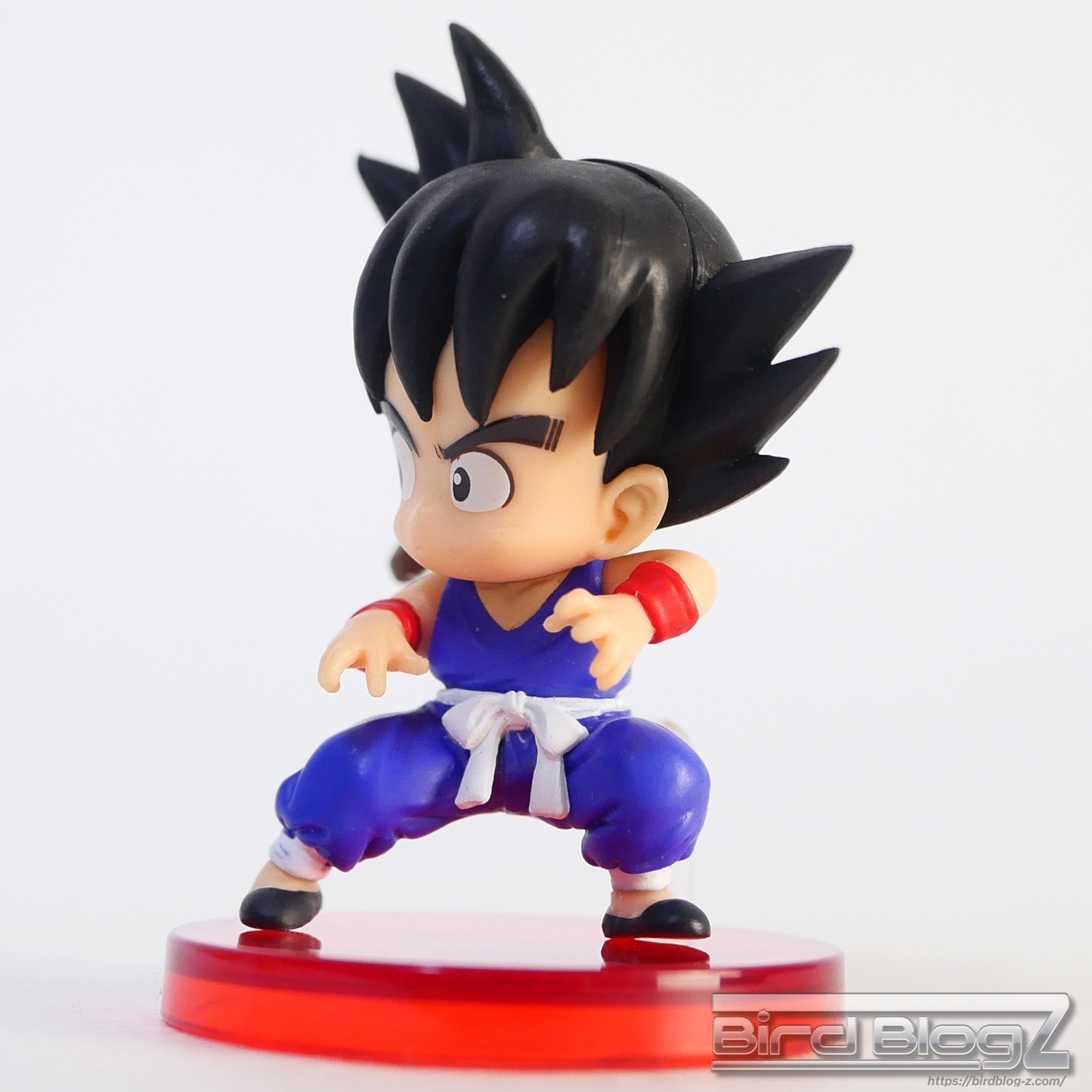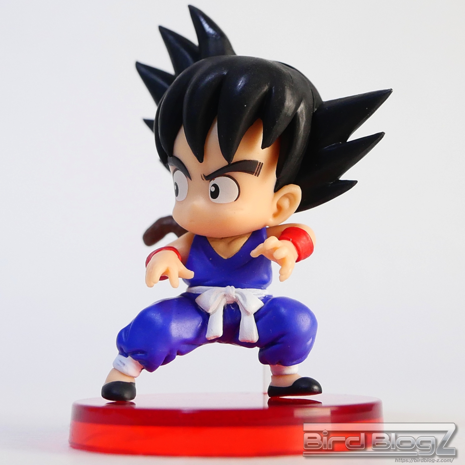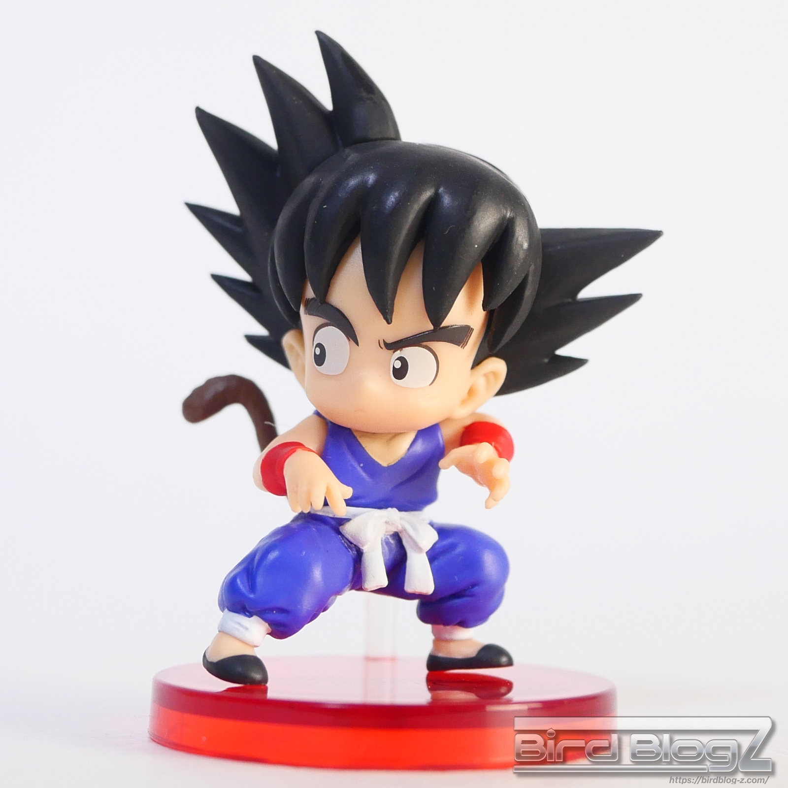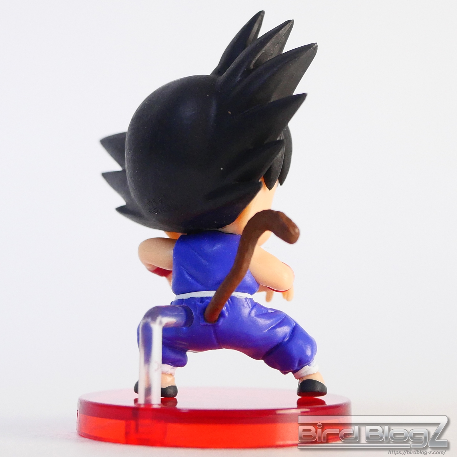 「む~むんむん・・・・・・・・・・」と薪割り前の構えポーズが造形。青紫の初期道着衣服が着用。道着の尻尾箇所は破れ造形があります。手、足を短くディフォルメされてかわいいです。