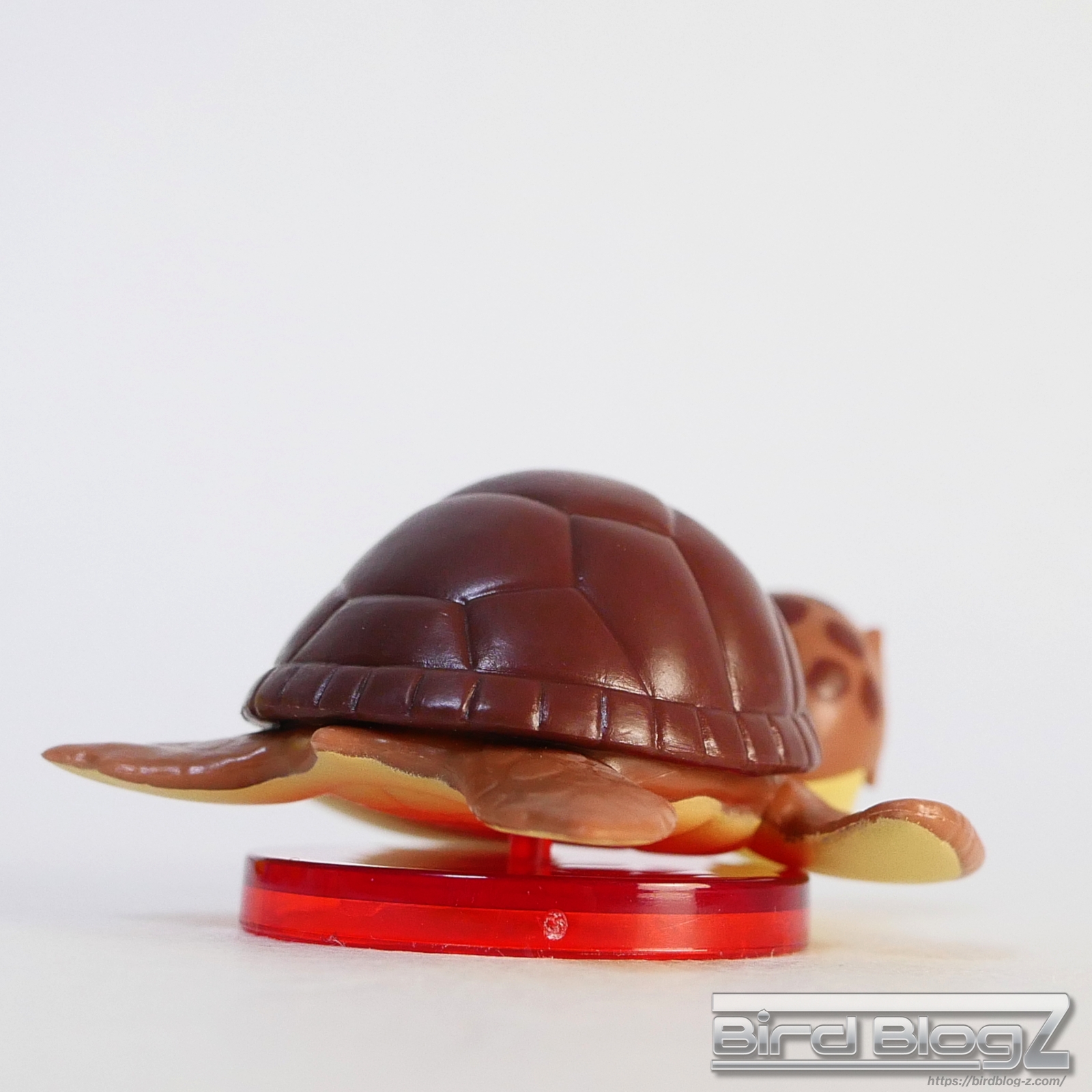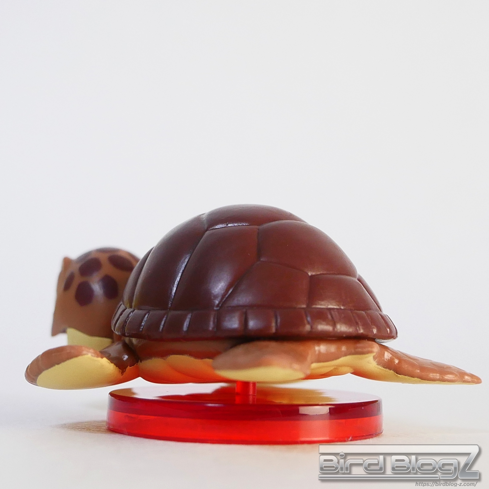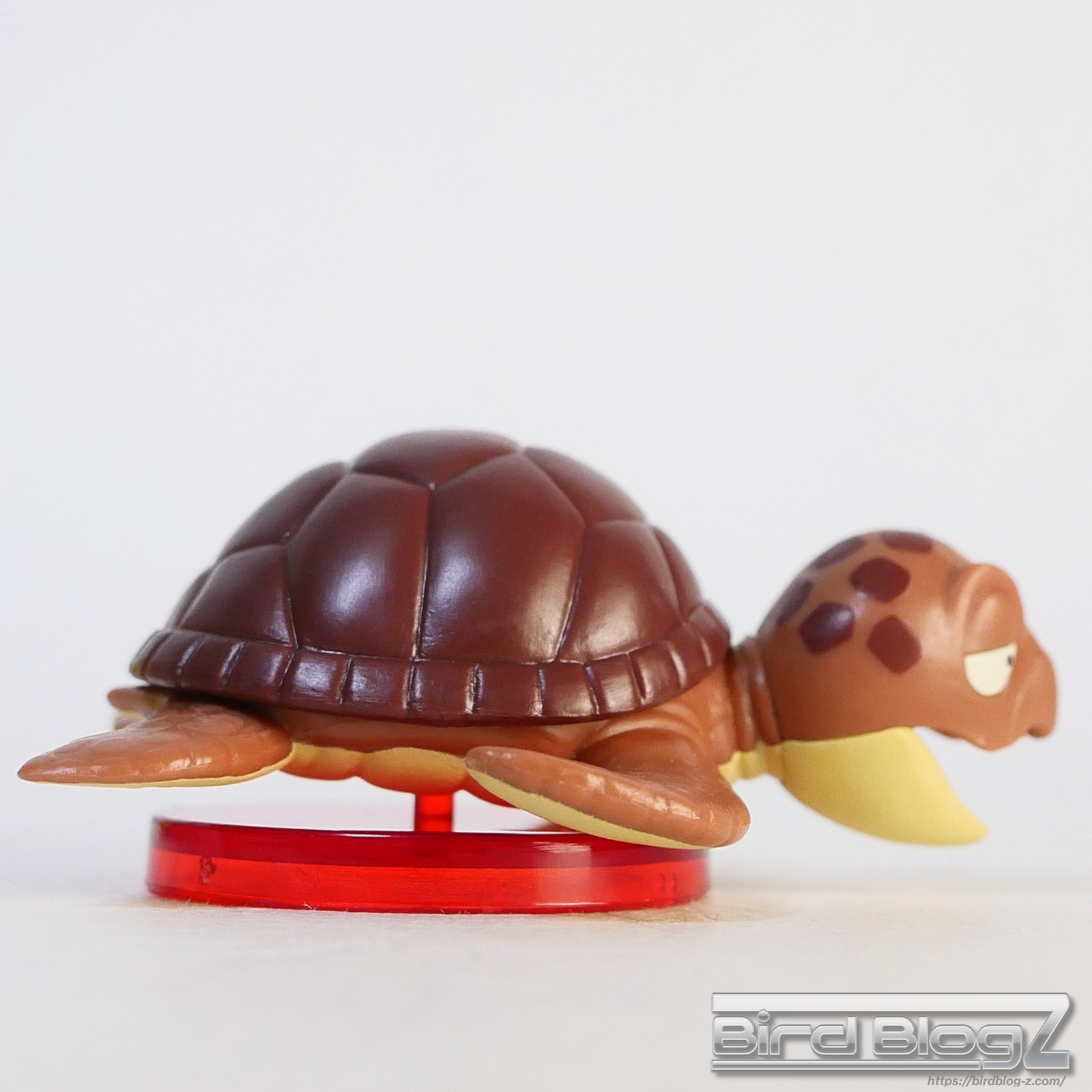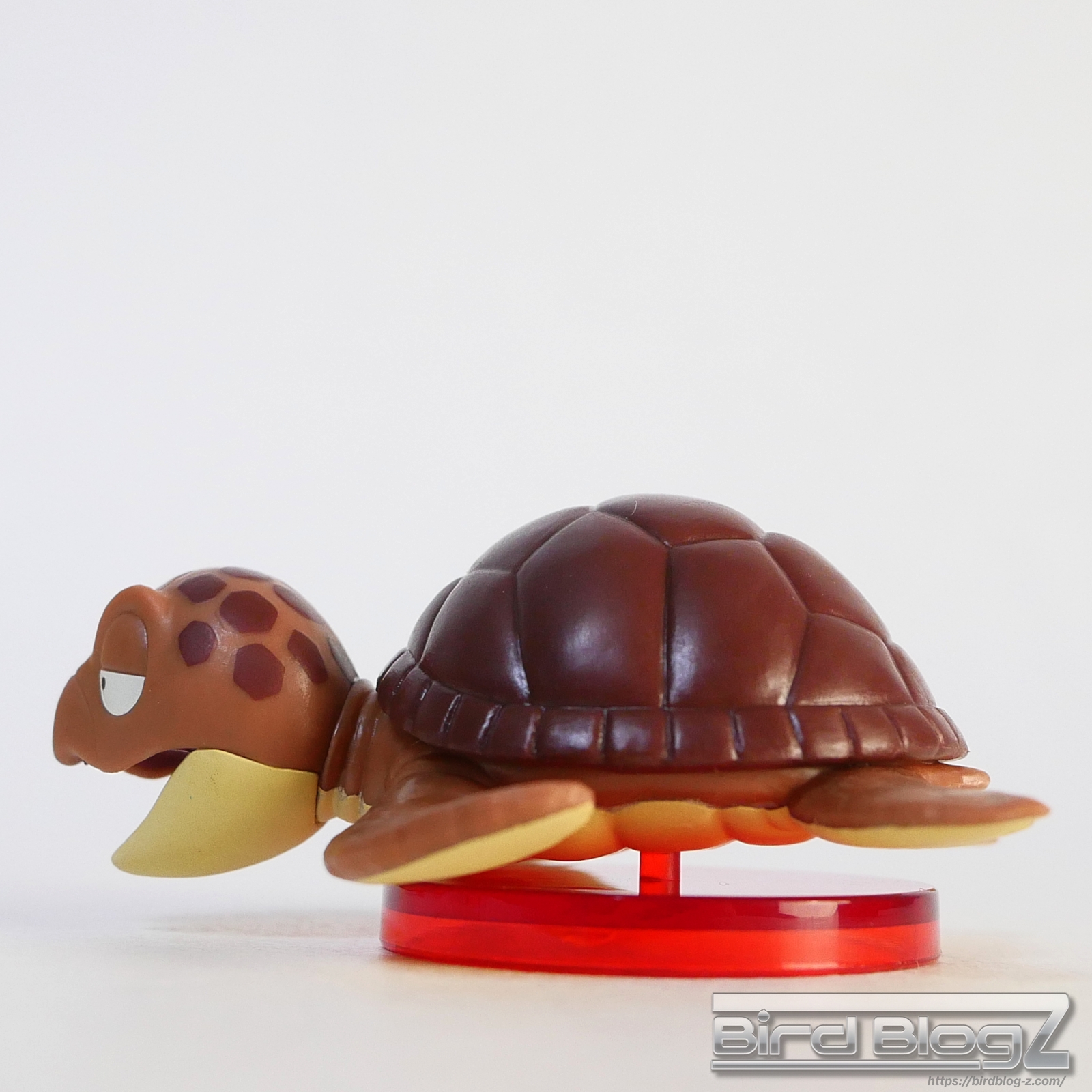 「おまたせしました!!」と亀仙人を甲羅に乗せて海を泳いできたウミガメを再現。甲羅の中に身体を隠せるようになしわが造形されています。台座と安定できるようにダボ穴があります。身体の裏側も造形されています。