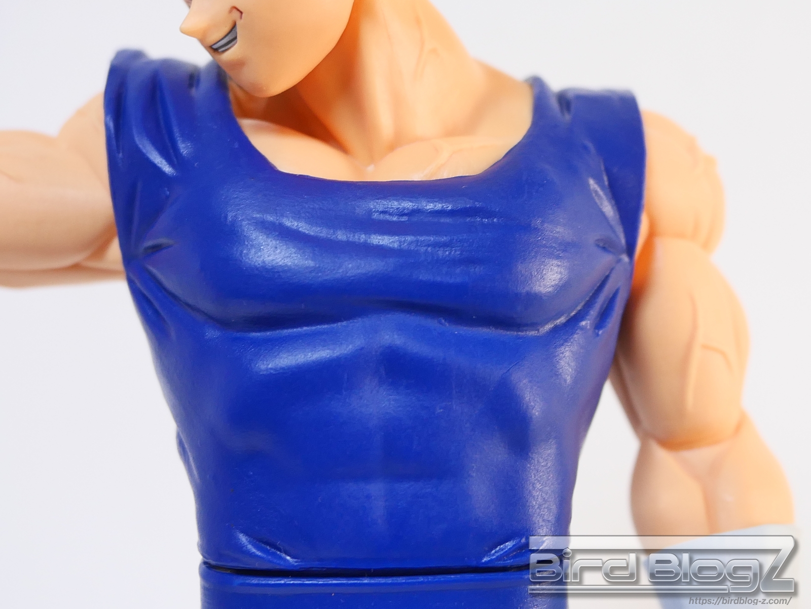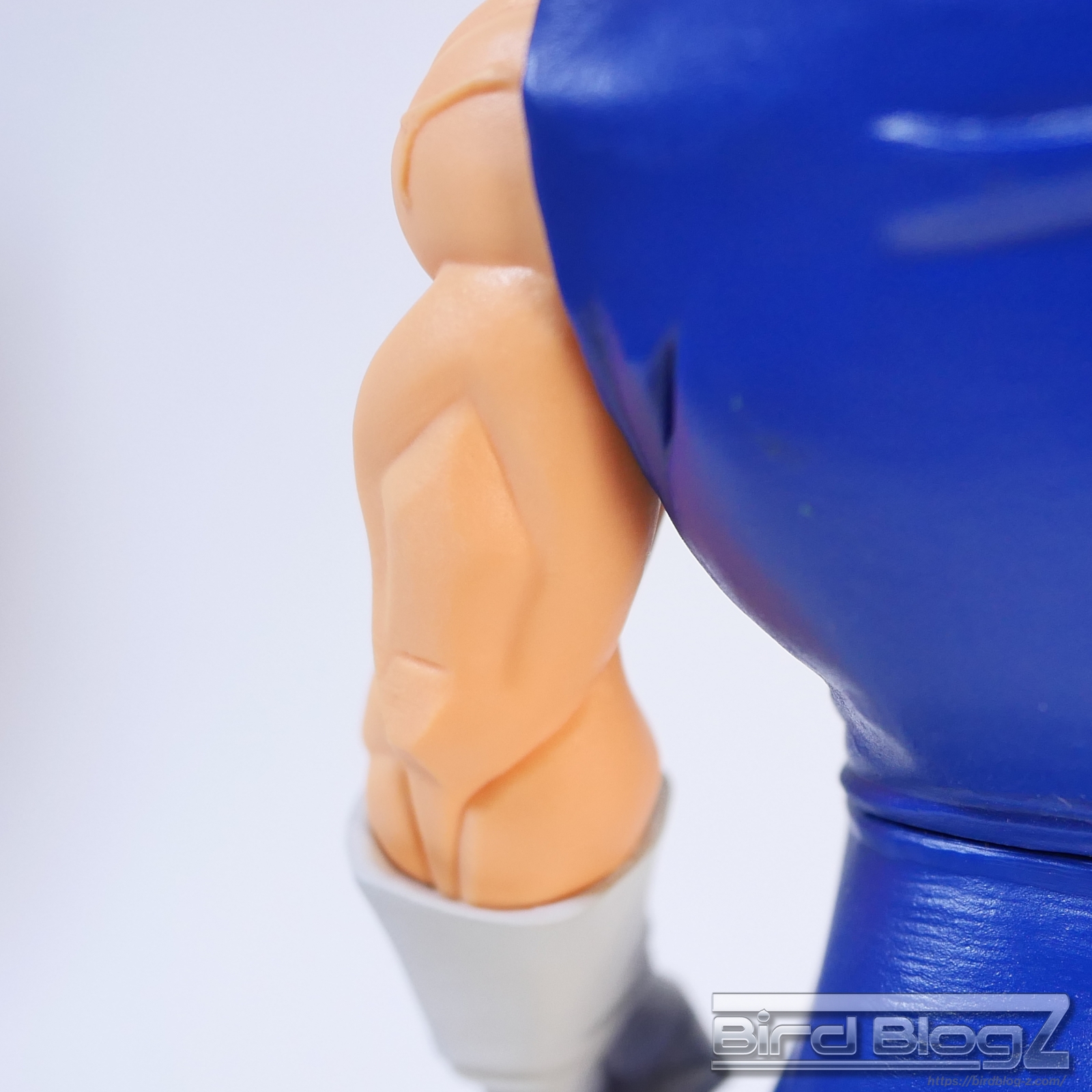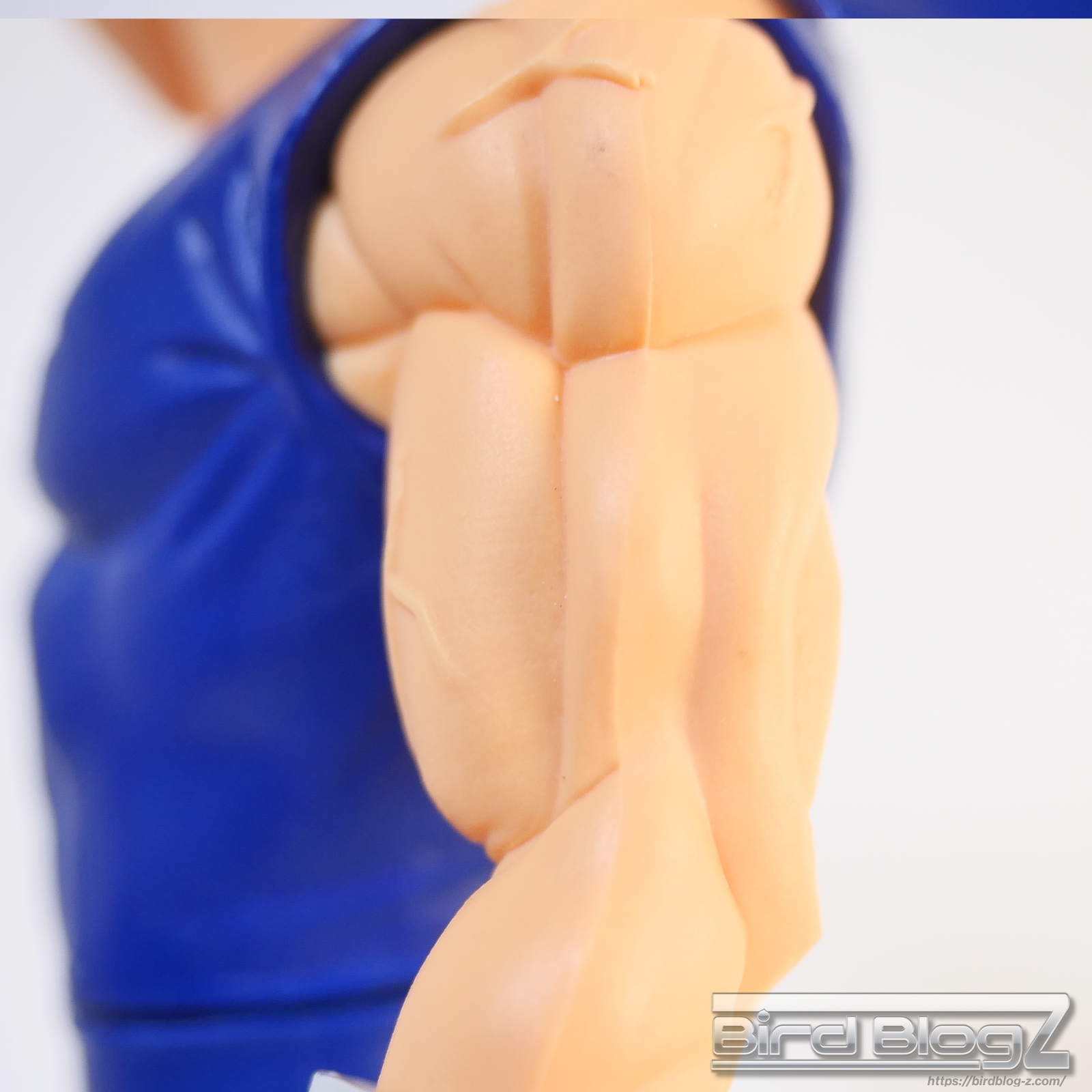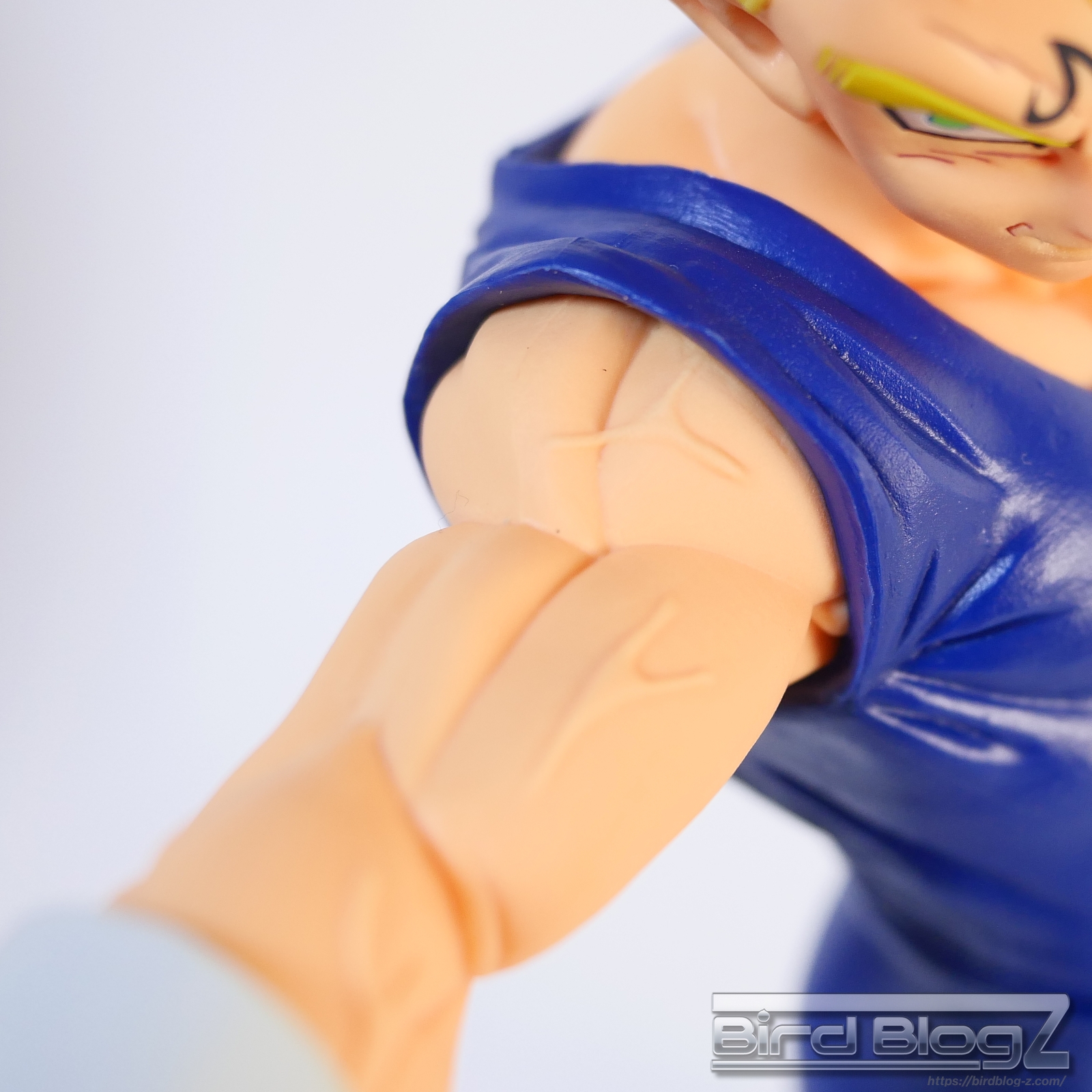 台座がなくても自立可能ですが支えパーツがあると安定性が高いです。額に浮き上がる血管や額の洗脳された”M”マーク。突き出す手のひらに目線も向いている表情は似ています。サイズが大きく上半身と下半身の分割線が目立つのと戦闘服は成型色でつや感が目立ちます。戦闘服の脇あたりのしわが大胸筋に大きさに引っ張られる造形や密着性の高い戦闘服の上からでもわかる筋肉造形があります。指先はやや反り返る造形がありドラゴンボールらしさがしっかりと出ています。
