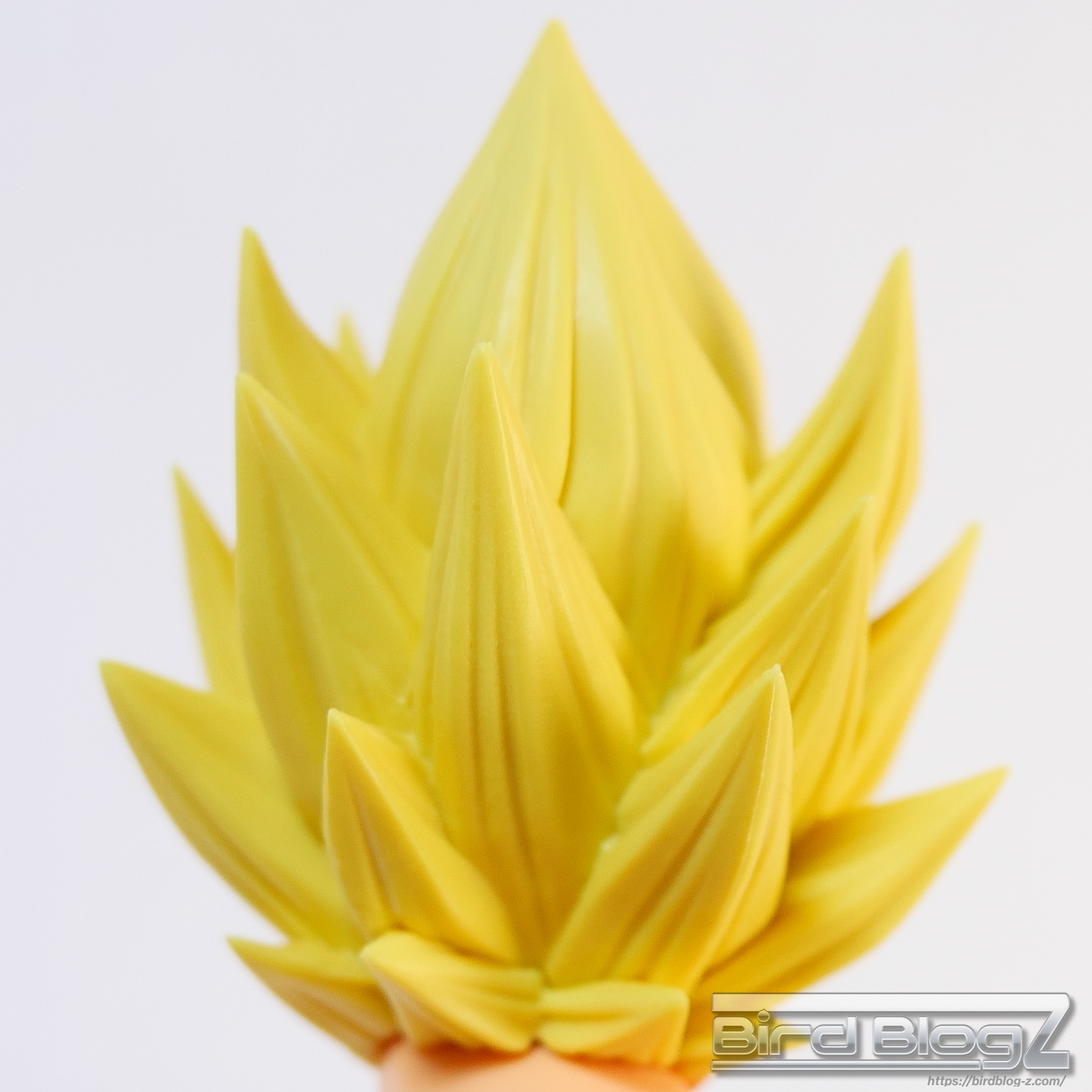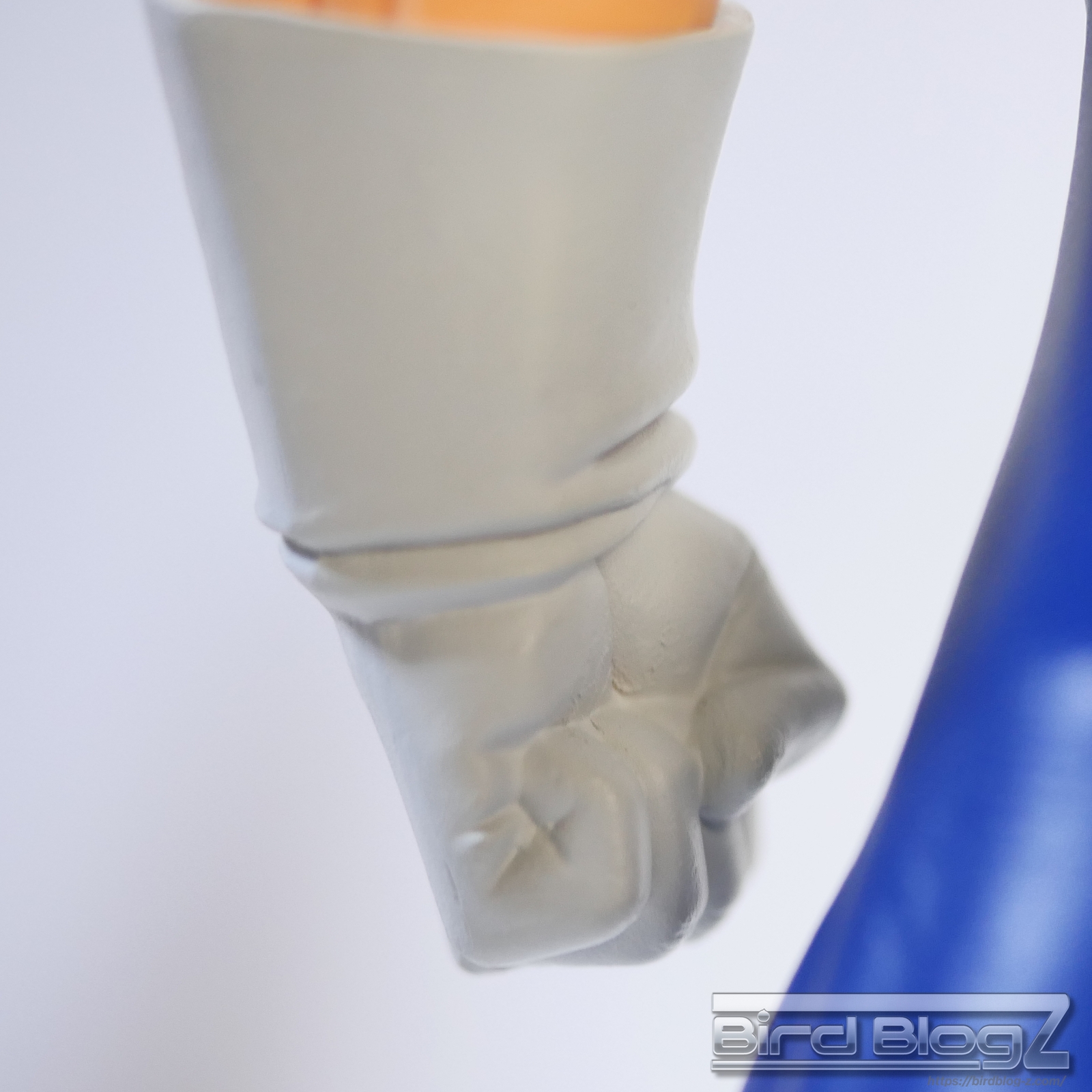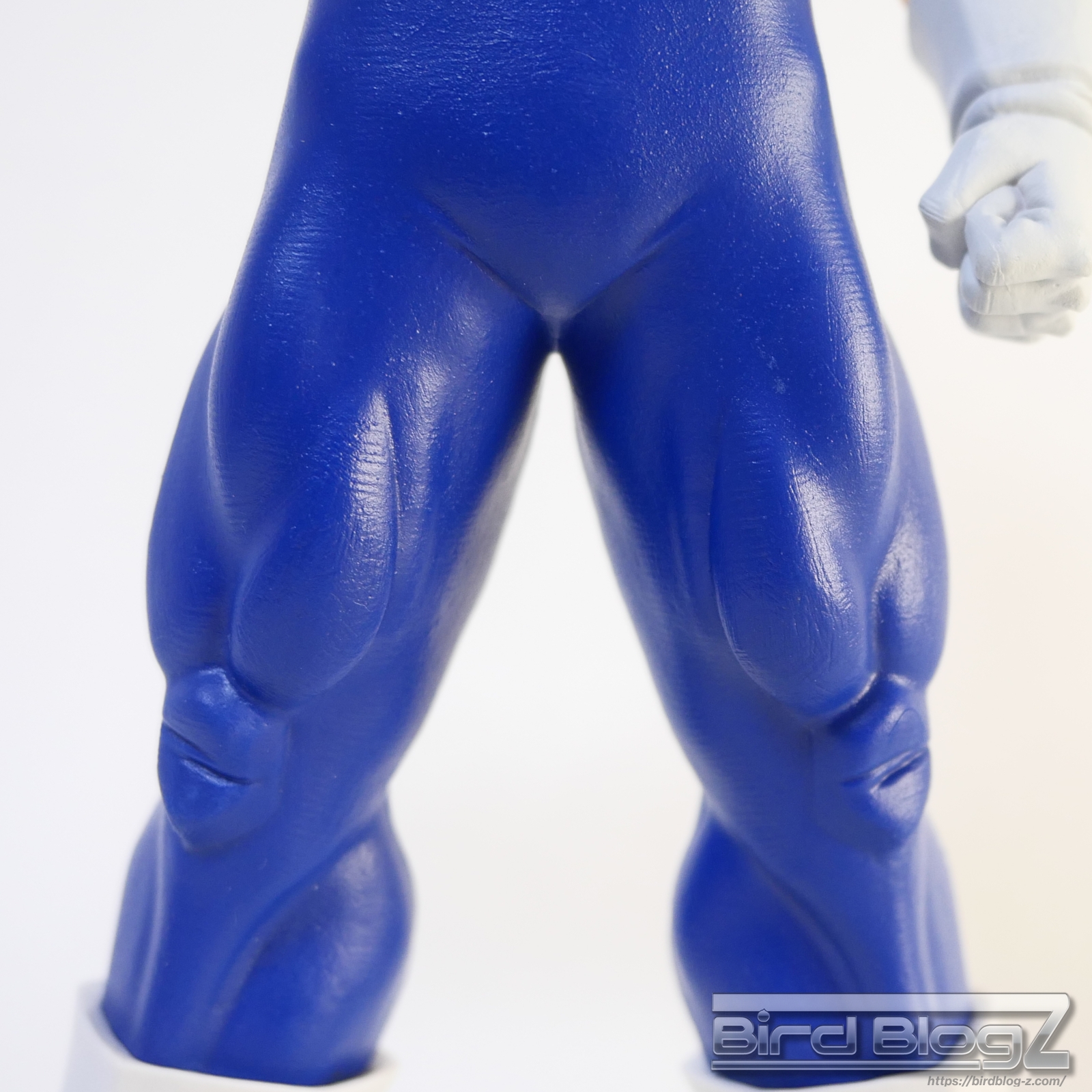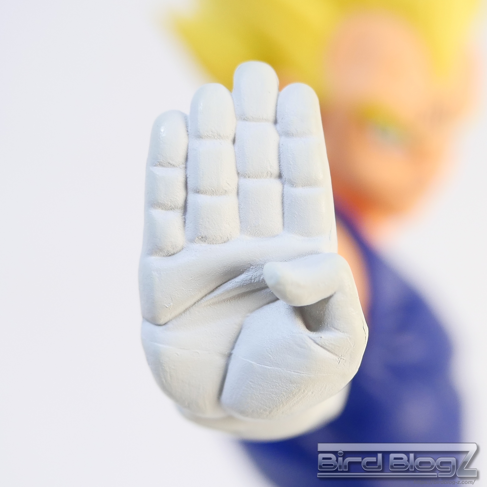 台座がなくても自立可能ですが支えパーツがあると安定性が高いです。額に浮き上がる血管や額の洗脳された”M”マーク。突き出す手のひらに目線も向いている表情は似ています。サイズが大きく上半身と下半身の分割線が目立つのと戦闘服は成型色でつや感が目立ちます。戦闘服の脇あたりのしわが大胸筋に大きさに引っ張られる造形や密着性の高い戦闘服の上からでもわかる筋肉造形があります。指先はやや反り返る造形がありドラゴンボールらしさがしっかりと出ています。