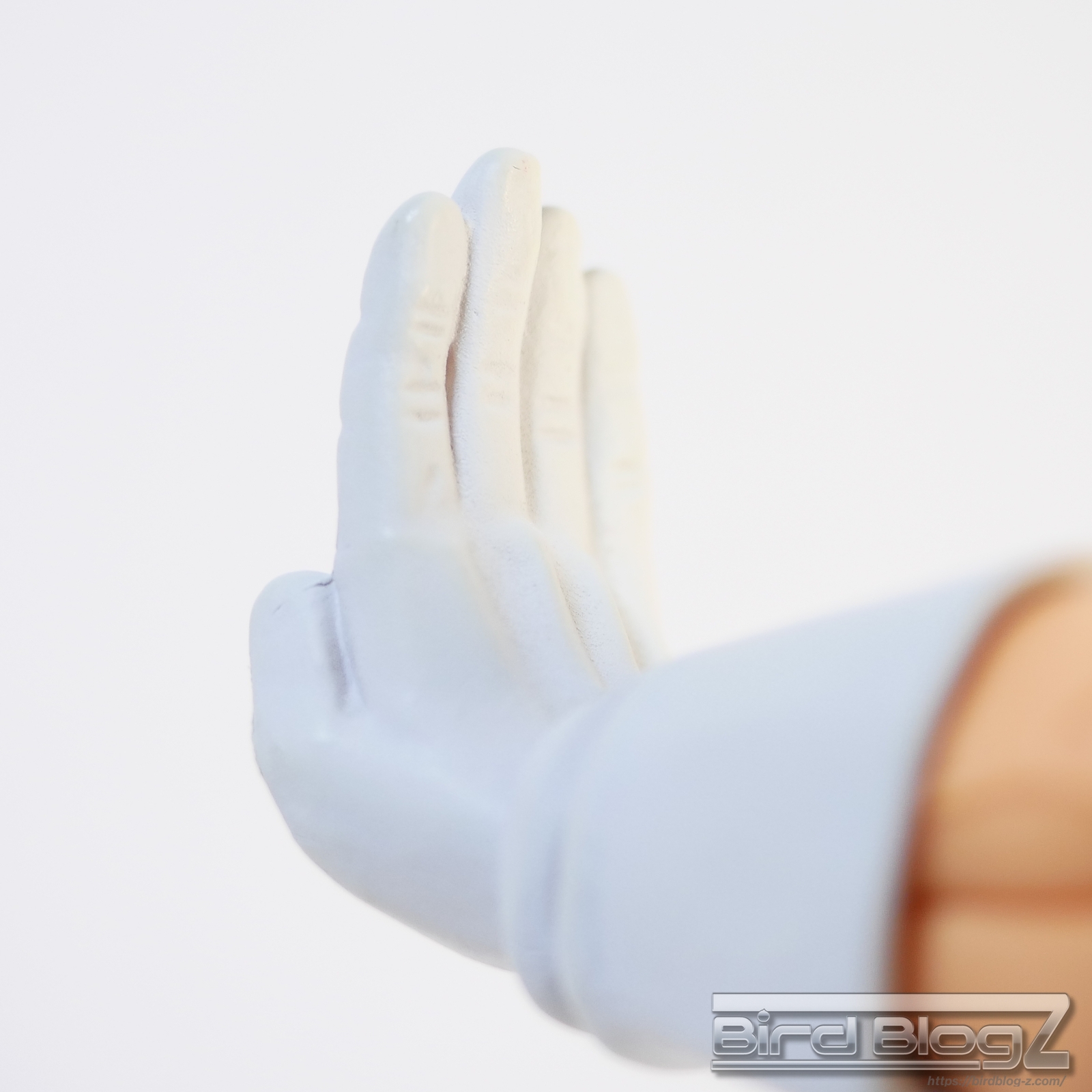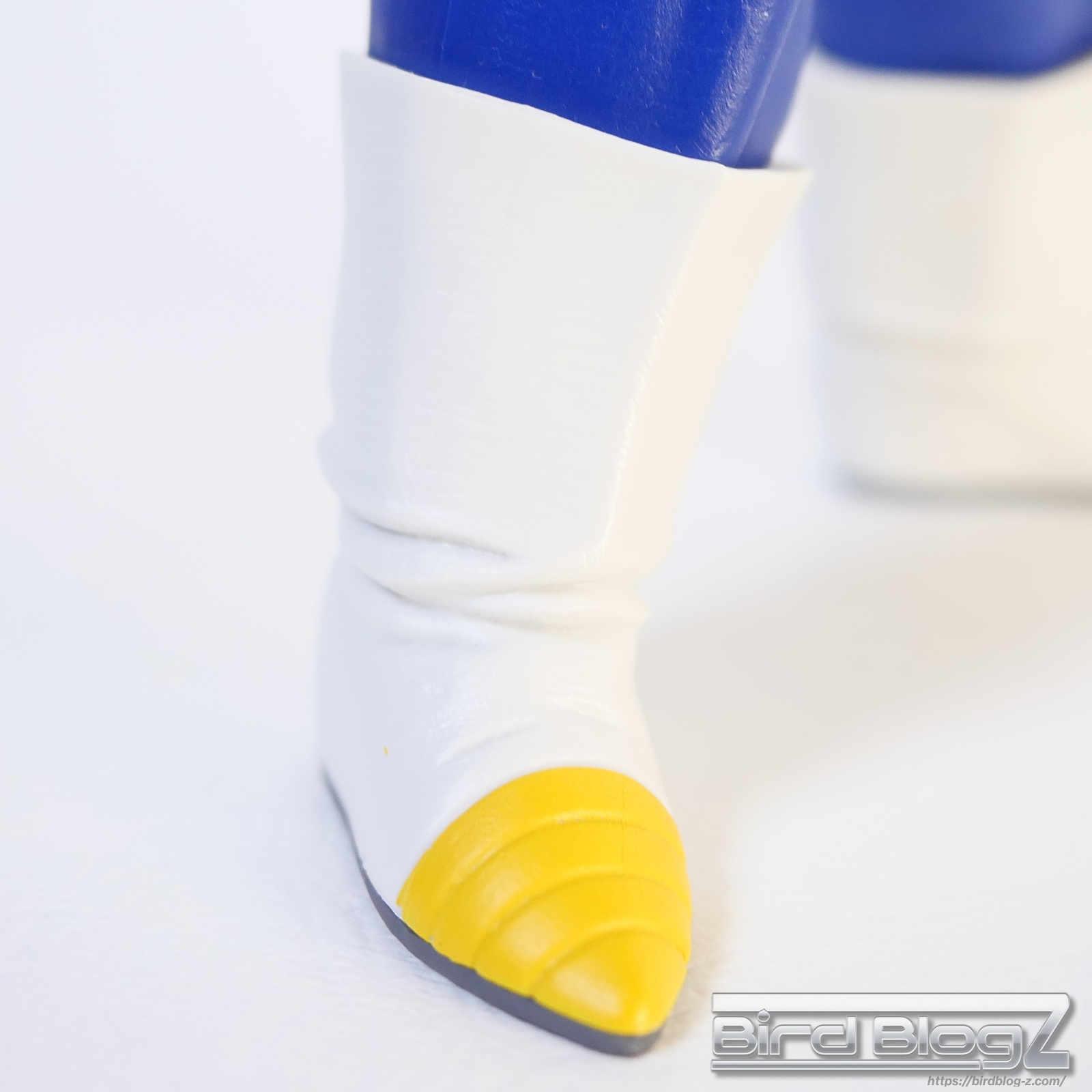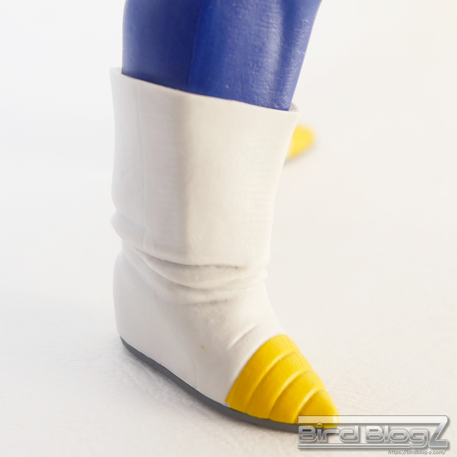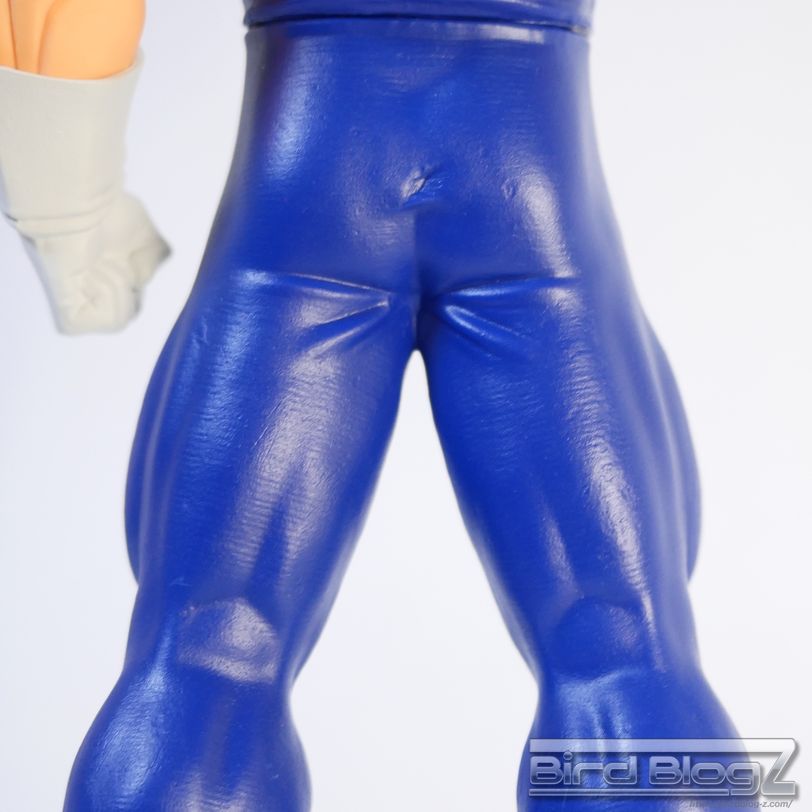 台座がなくても自立可能ですが支えパーツがあると安定性が高いです。額に浮き上がる血管や額の洗脳された”M”マーク。突き出す手のひらに目線も向いている表情は似ています。サイズが大きく上半身と下半身の分割線が目立つのと戦闘服は成型色でつや感が目立ちます。戦闘服の脇あたりのしわが大胸筋に大きさに引っ張られる造形や密着性の高い戦闘服の上からでもわかる筋肉造形があります。指先はやや反り返る造形がありドラゴンボールらしさがしっかりと出ています。