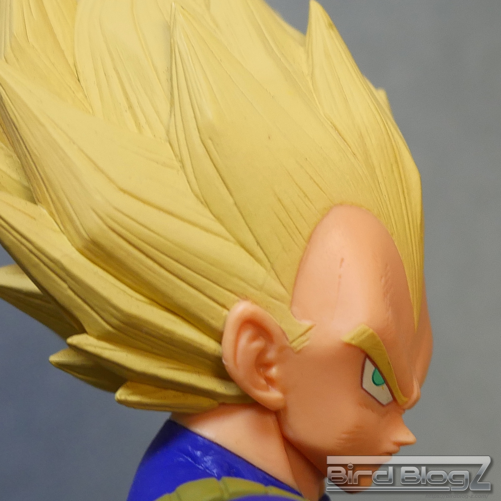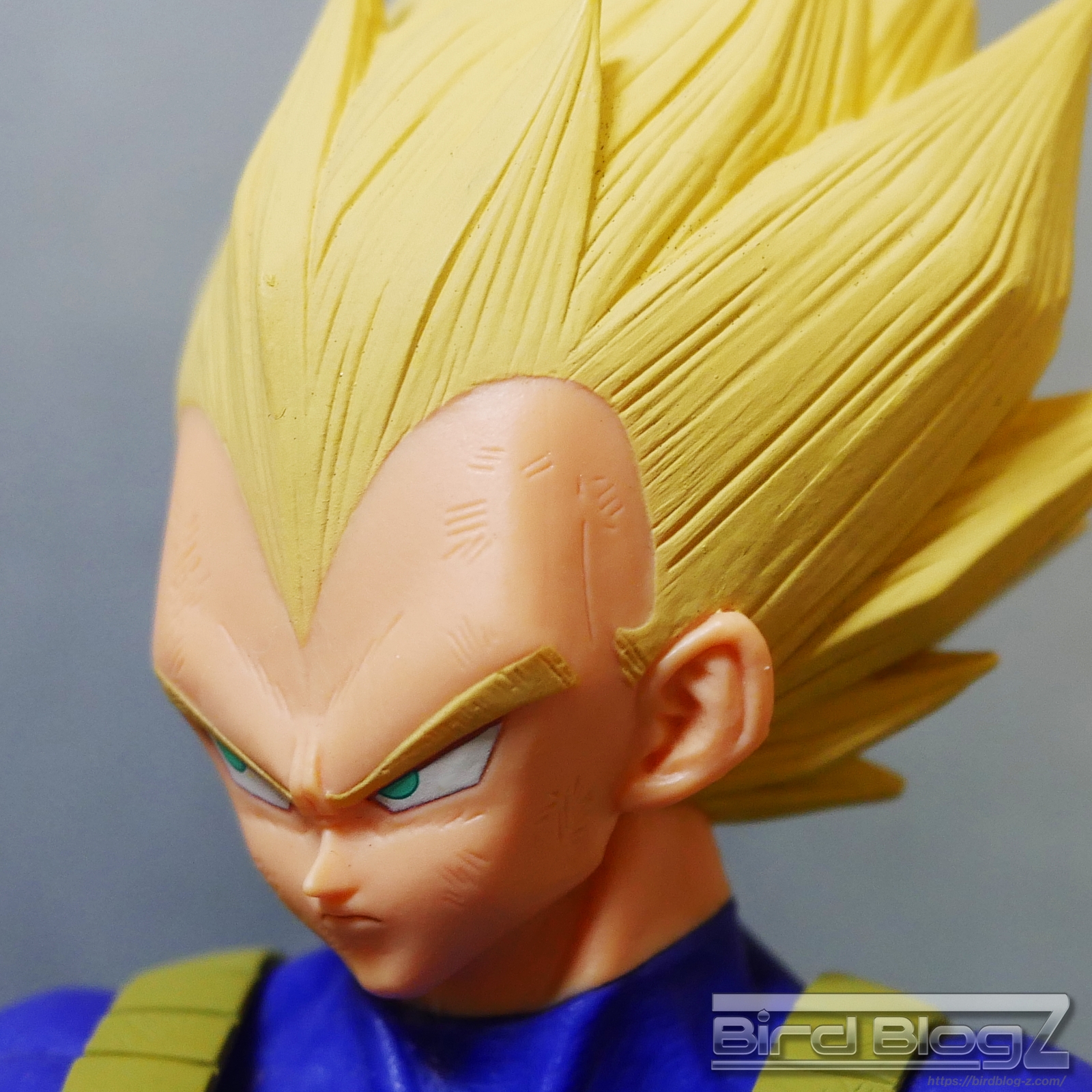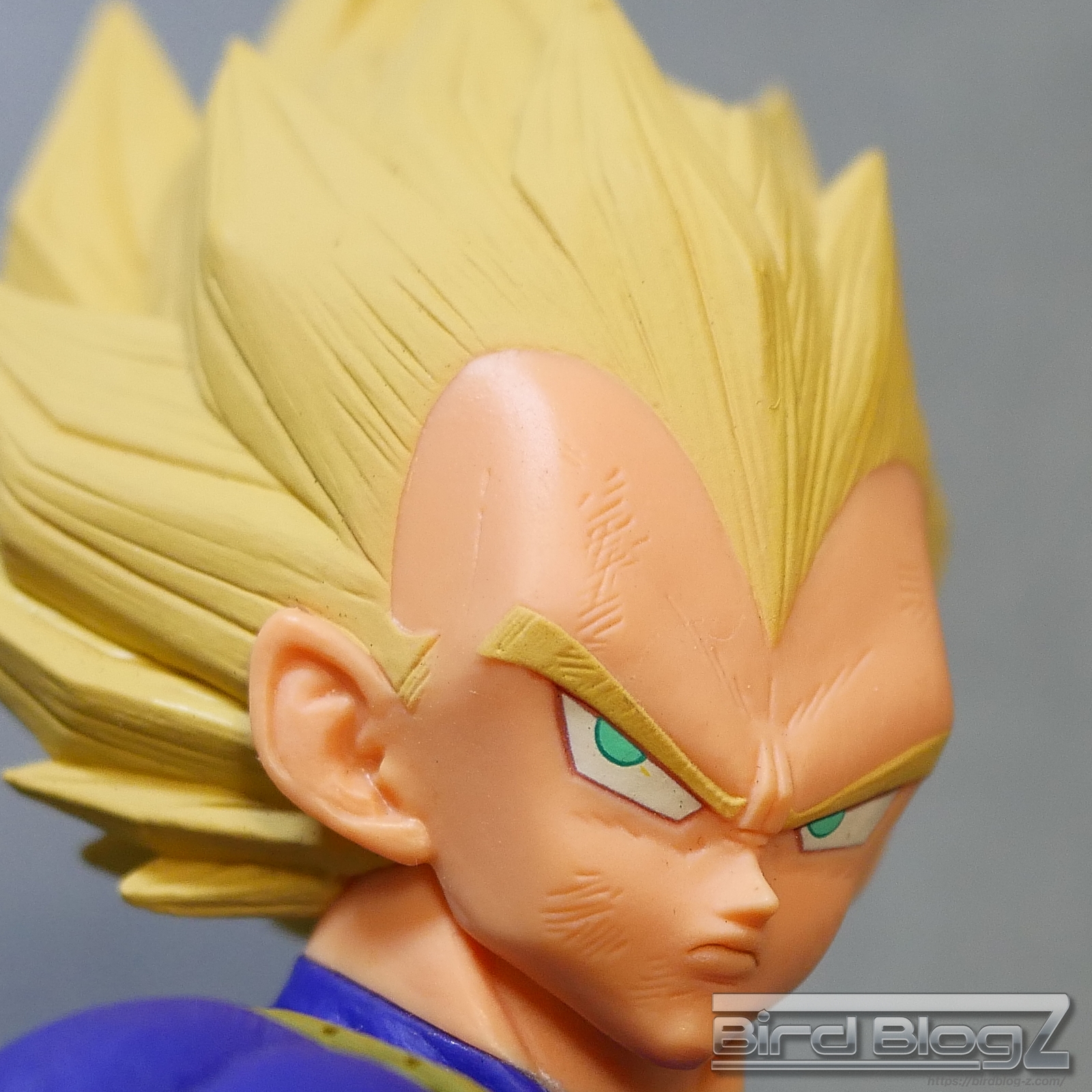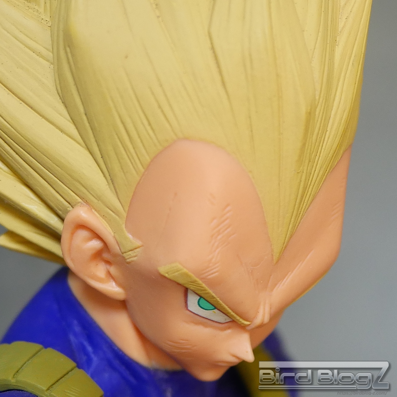 髪のモールドは繊細で強弱な造形と淡い黄色の彩色はシンプル過ぎなく表現されています。眉上のふくらみ(眉丘筋)がわかりやすく造形してあり、ベジータの特徴も再現されています。アイプリ(瞳の印刷)のズレもなく、瞳はエメラルドグリーンです。角度を変えても破綻しません。