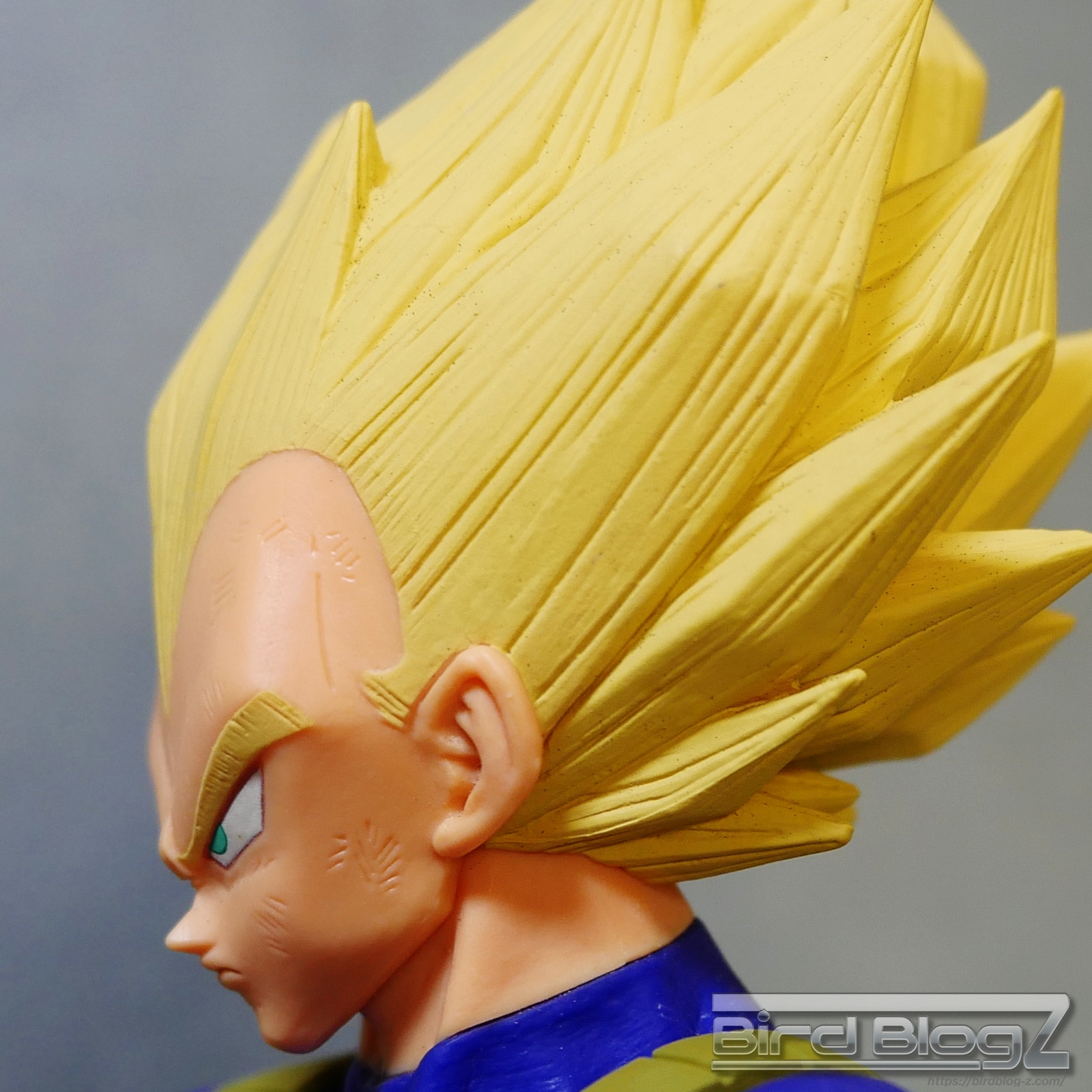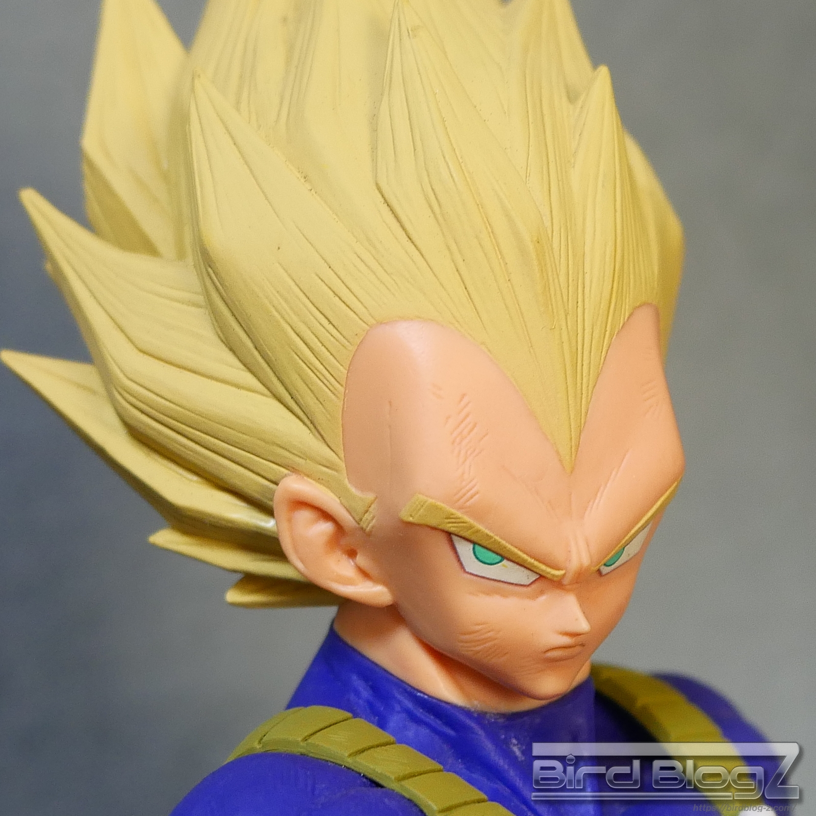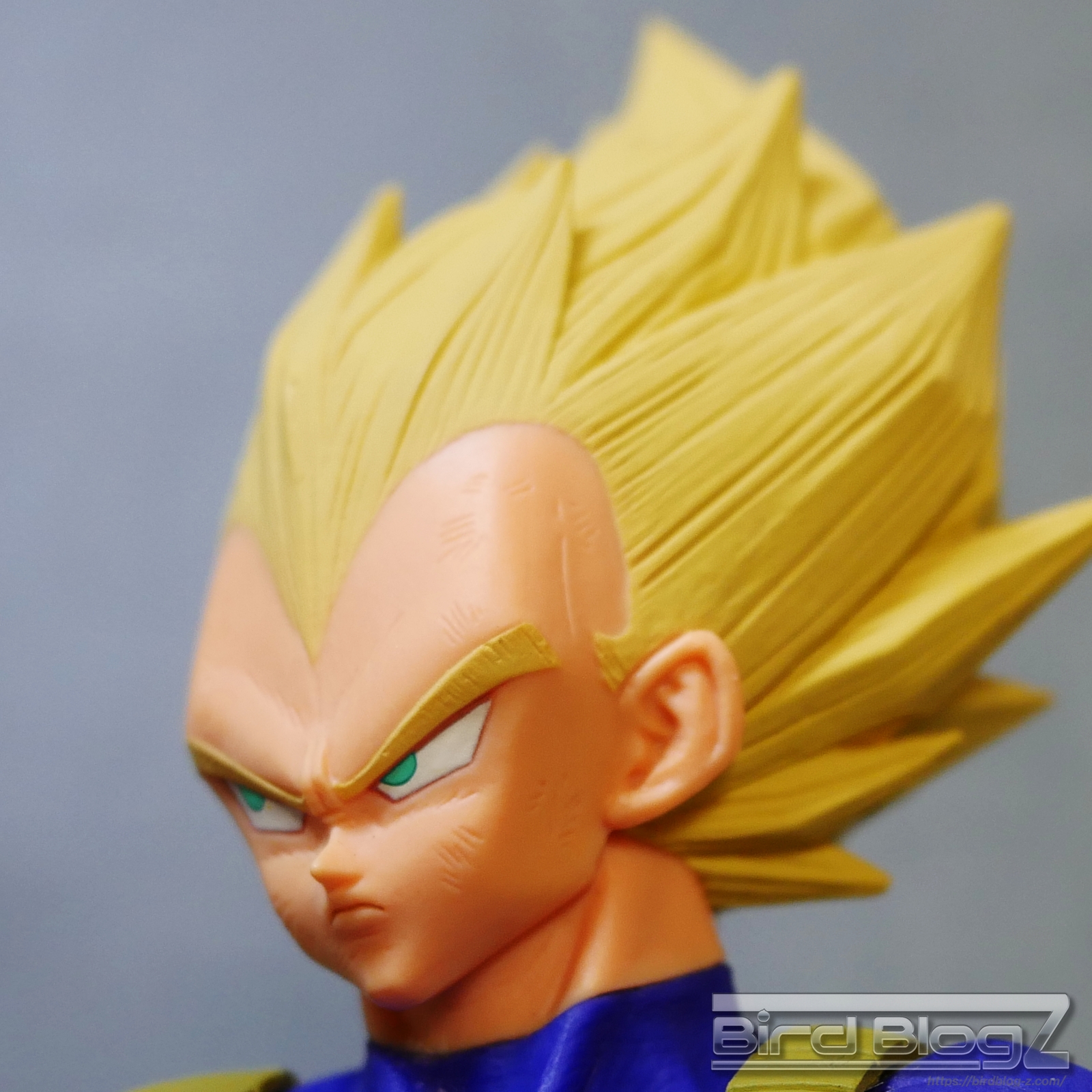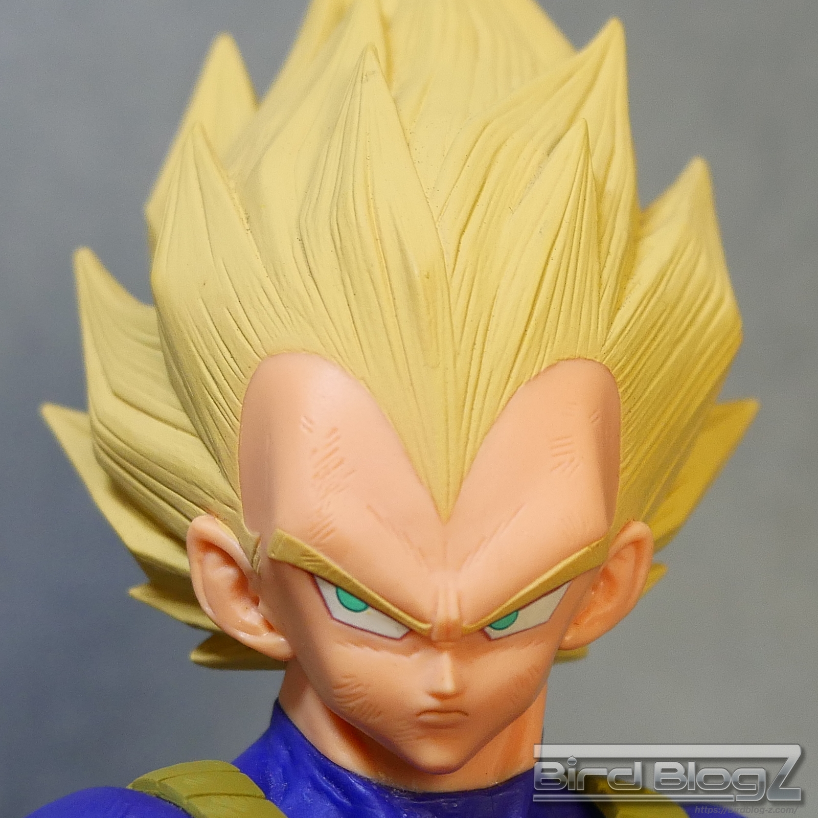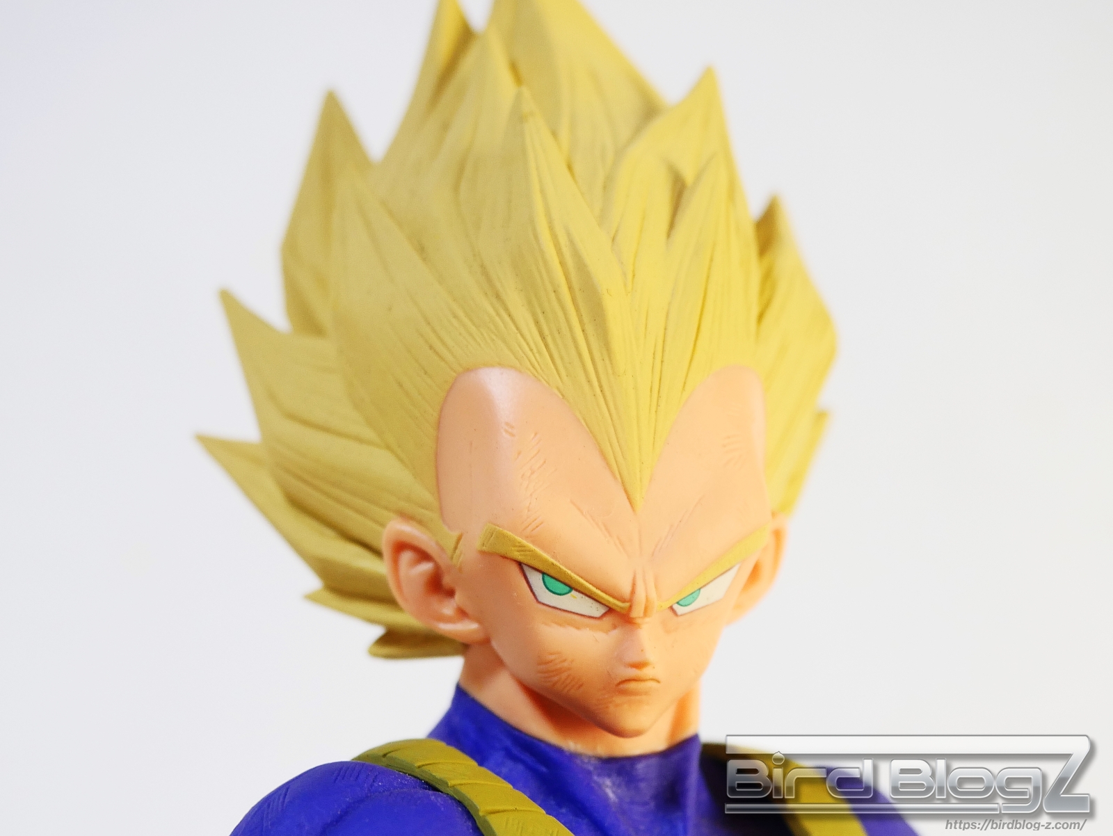 髪のモールドは繊細で強弱な造形と淡い黄色の彩色はシンプル過ぎなく表現されています。眉上のふくらみ(眉丘筋)がわかりやすく造形してあり、ベジータの特徴も再現されています。アイプリ(瞳の印刷)のズレもなく、瞳はエメラルドグリーンです。角度を変えても破綻しません。