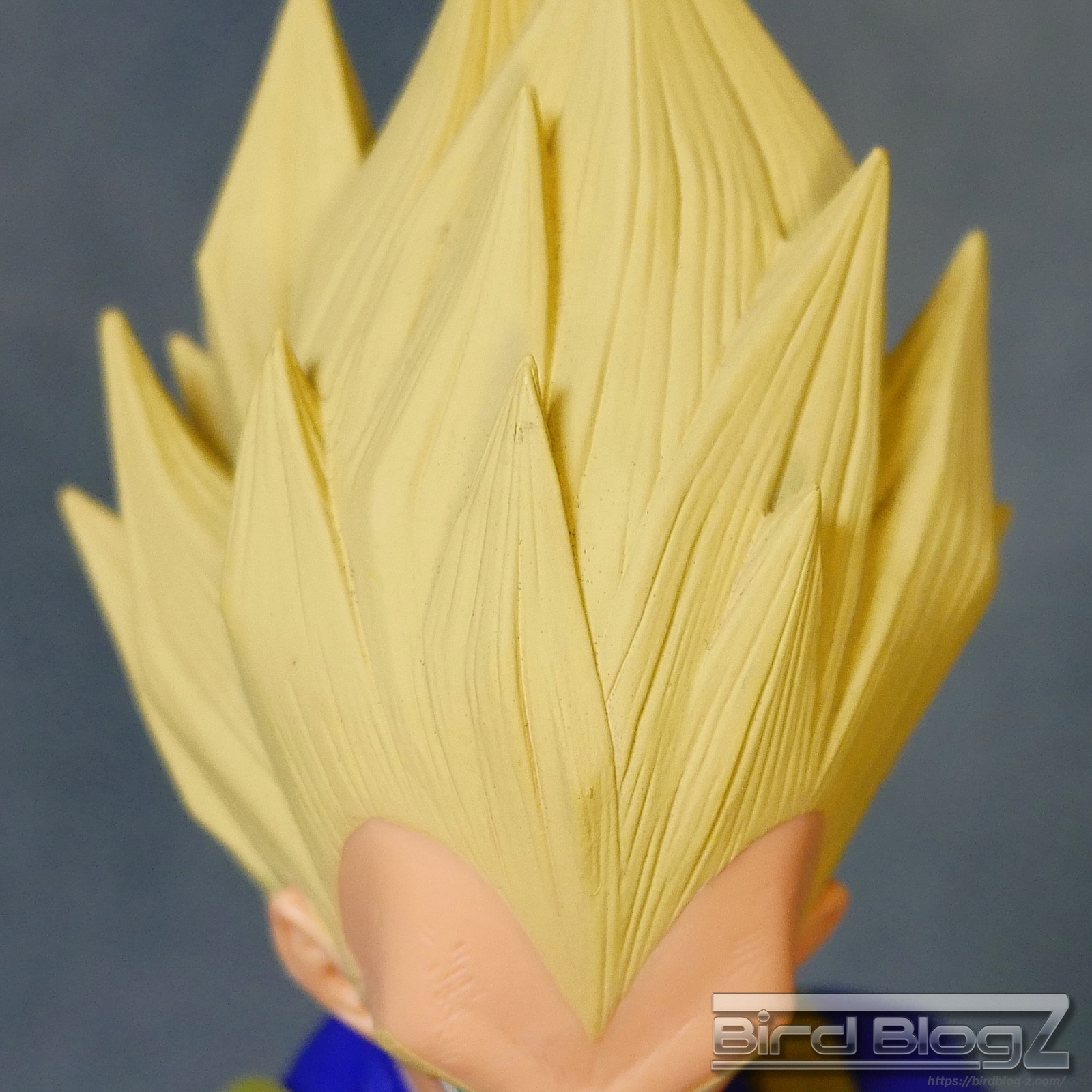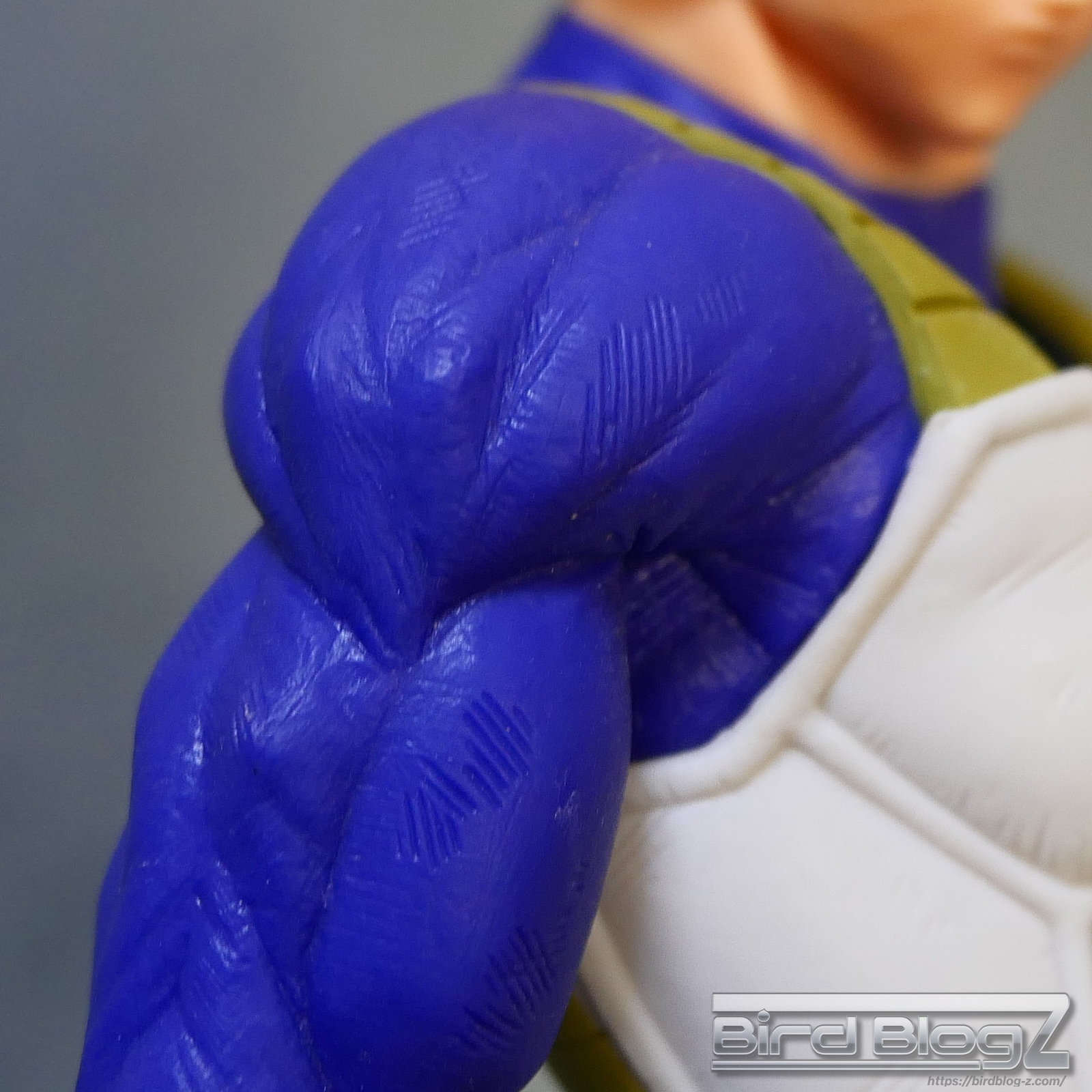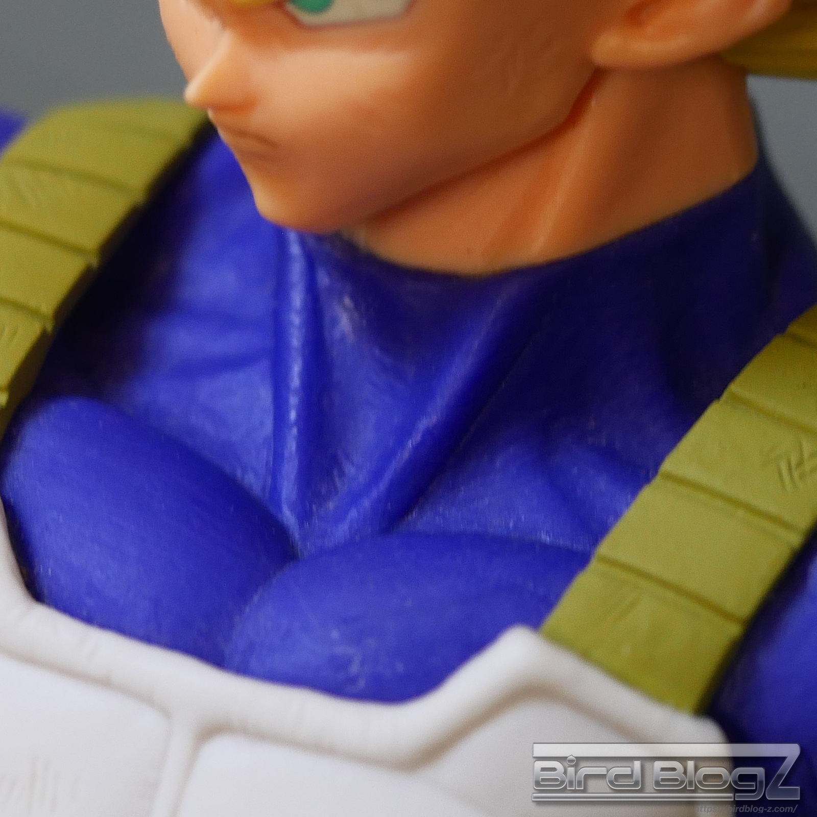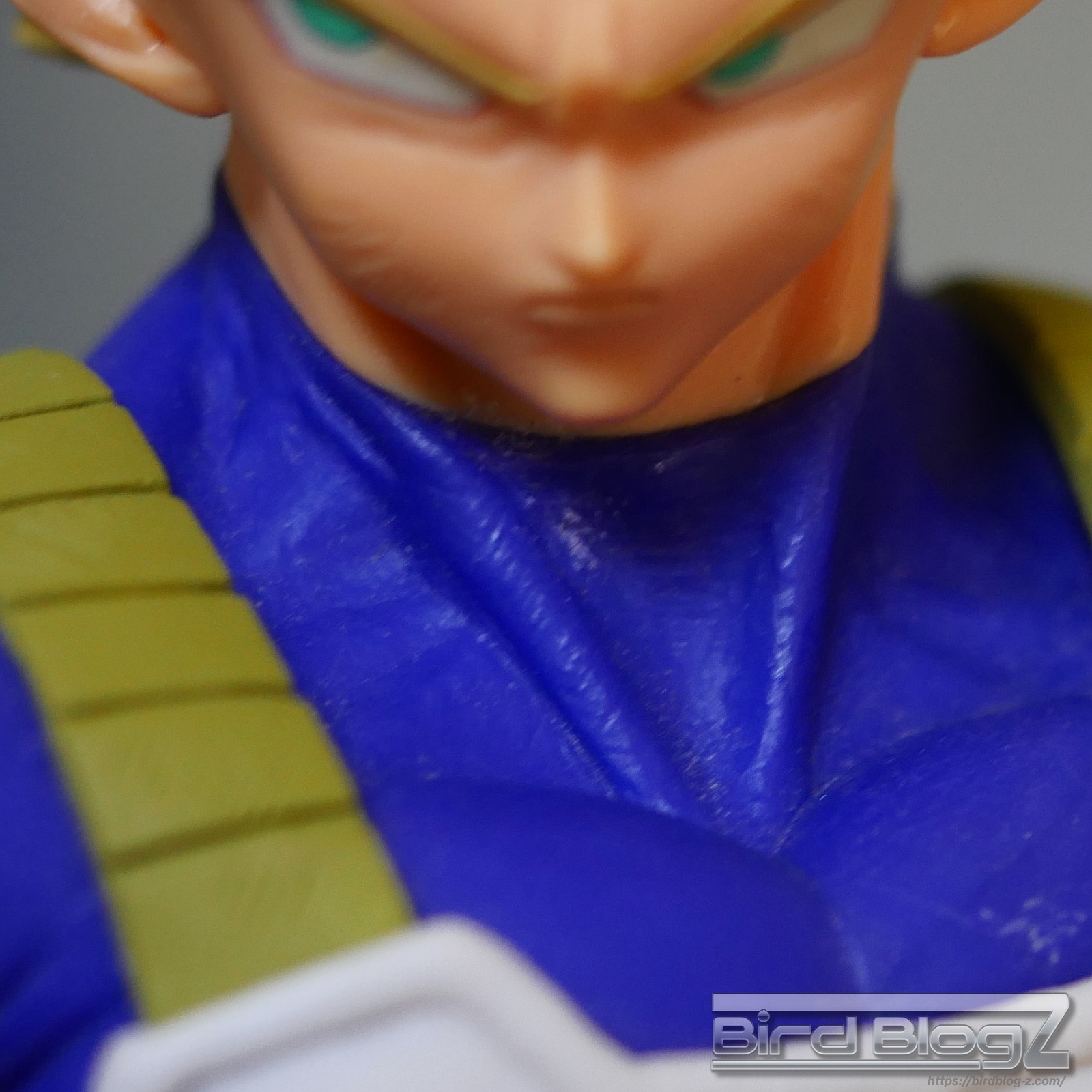 髪のモールドは繊細で強弱な造形と淡い黄色の彩色はシンプル過ぎなく表現されています。眉上のふくらみ(眉丘筋)がわかりやすく造形してあり、ベジータの特徴も再現されています。アイプリ(瞳の印刷)のズレもなく、瞳はエメラルドグリーンです。角度を変えても破綻しません。