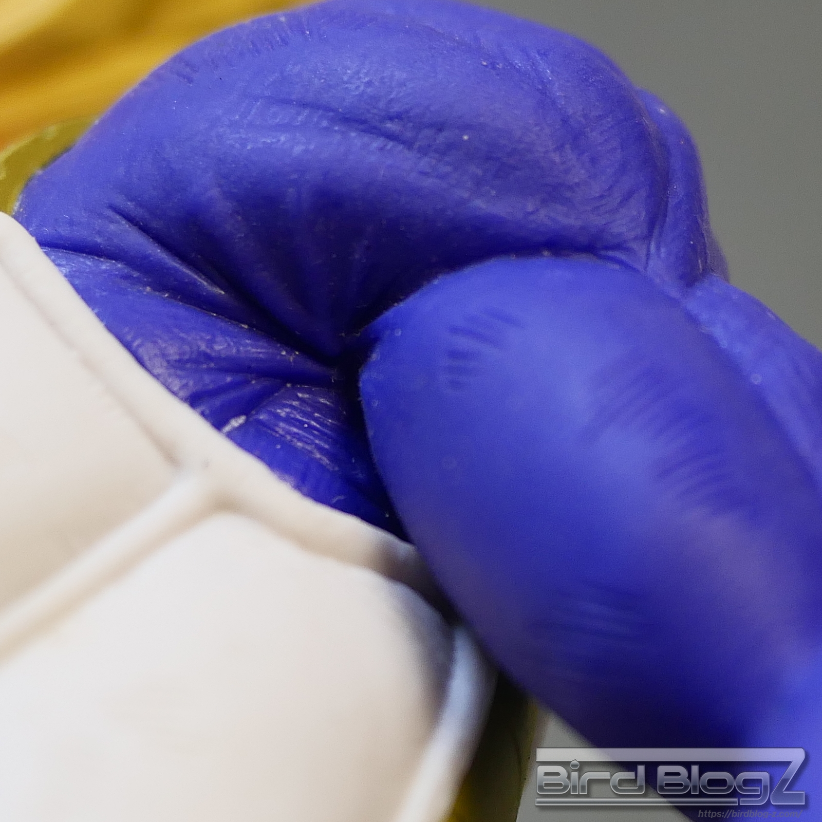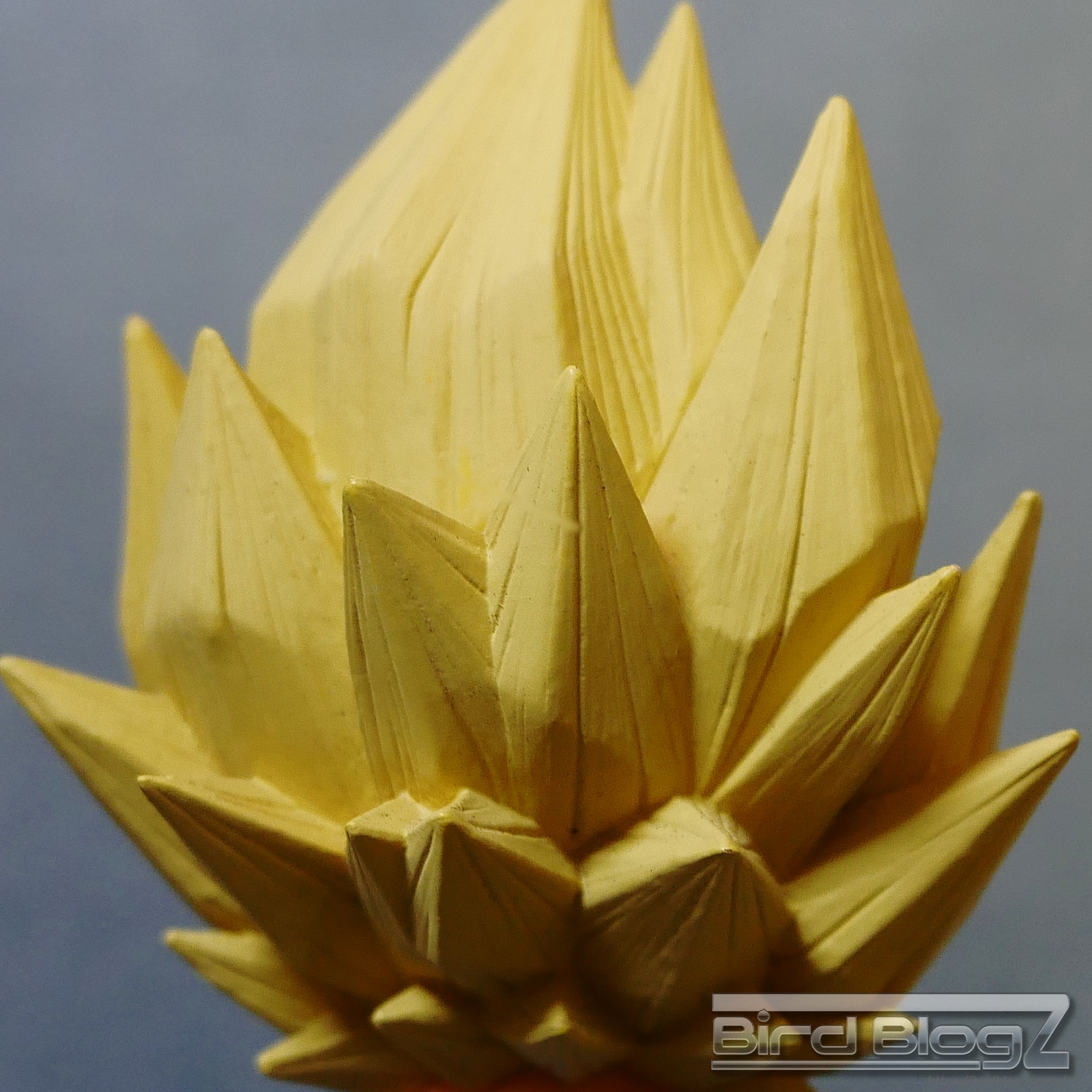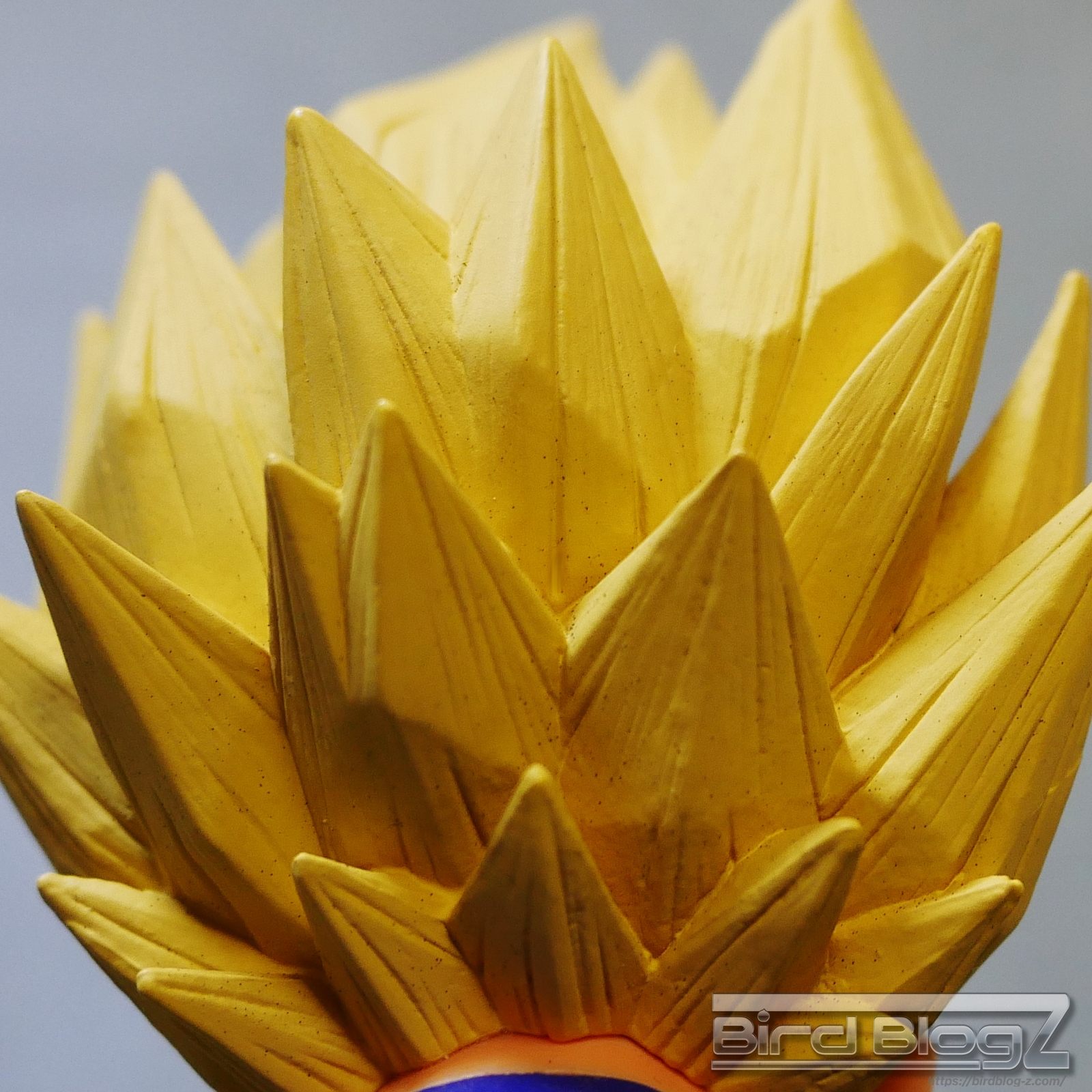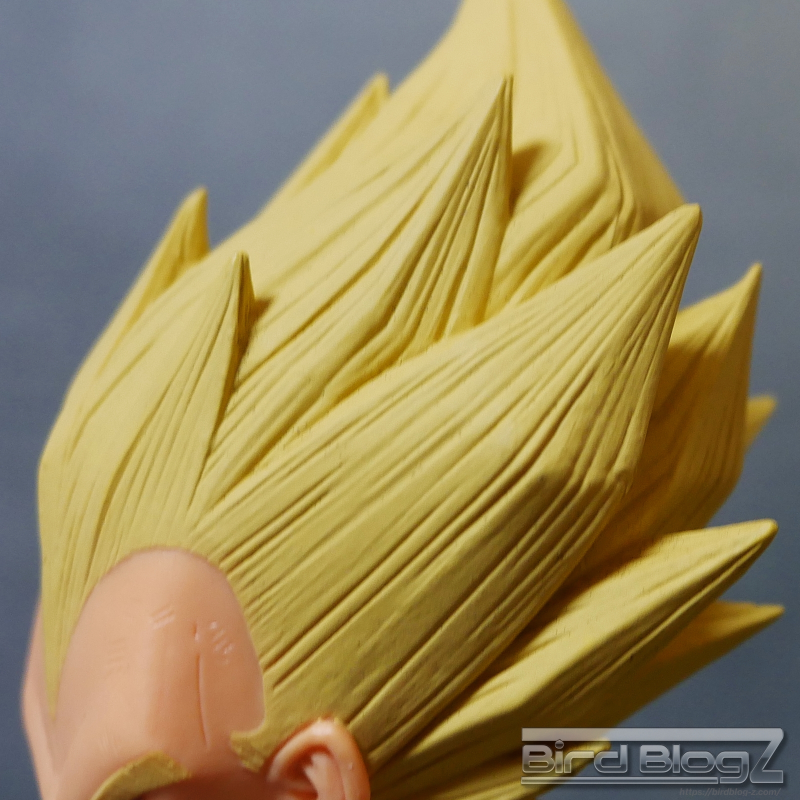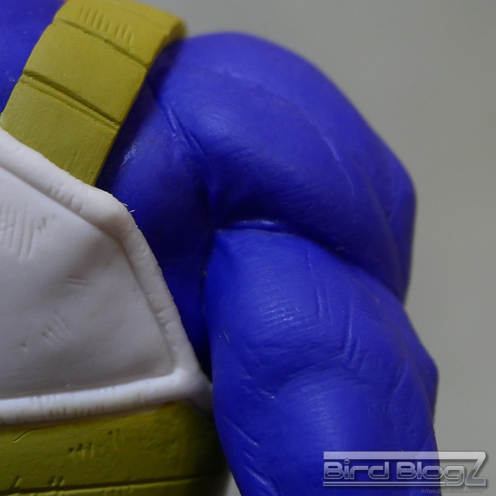 髪のモールドは繊細で強弱な造形と淡い黄色の彩色はシンプル過ぎなく表現されています。眉上のふくらみ(眉丘筋)がわかりやすく造形してあり、ベジータの特徴も再現されています。アイプリ(瞳の印刷)のズレもなく、瞳はエメラルドグリーンです。角度を変えても破綻しません。