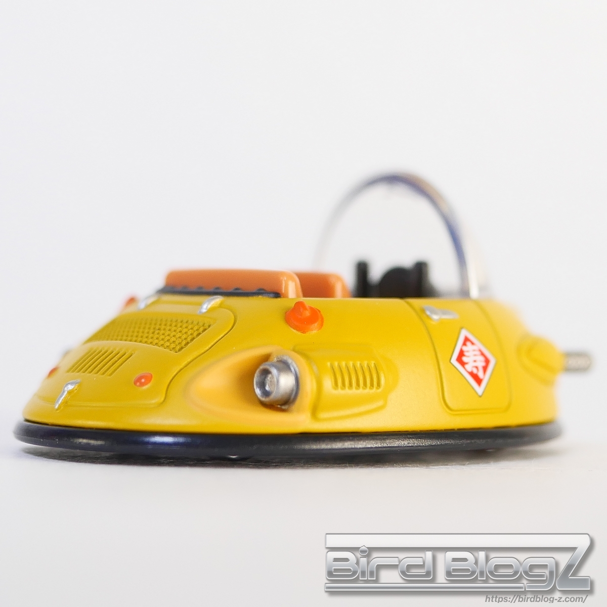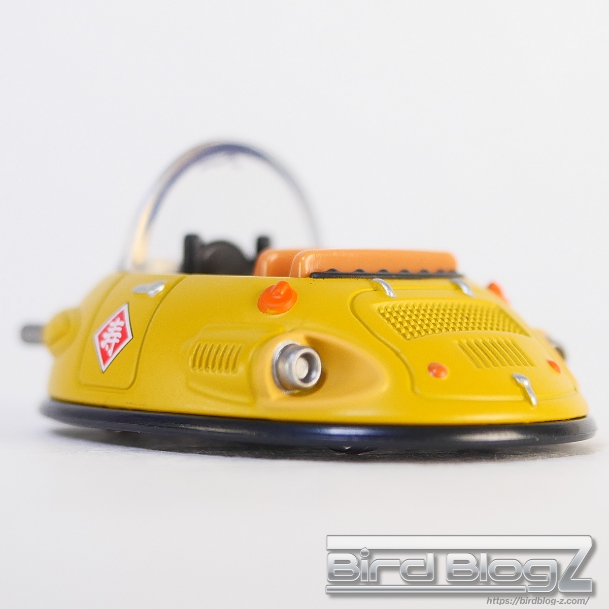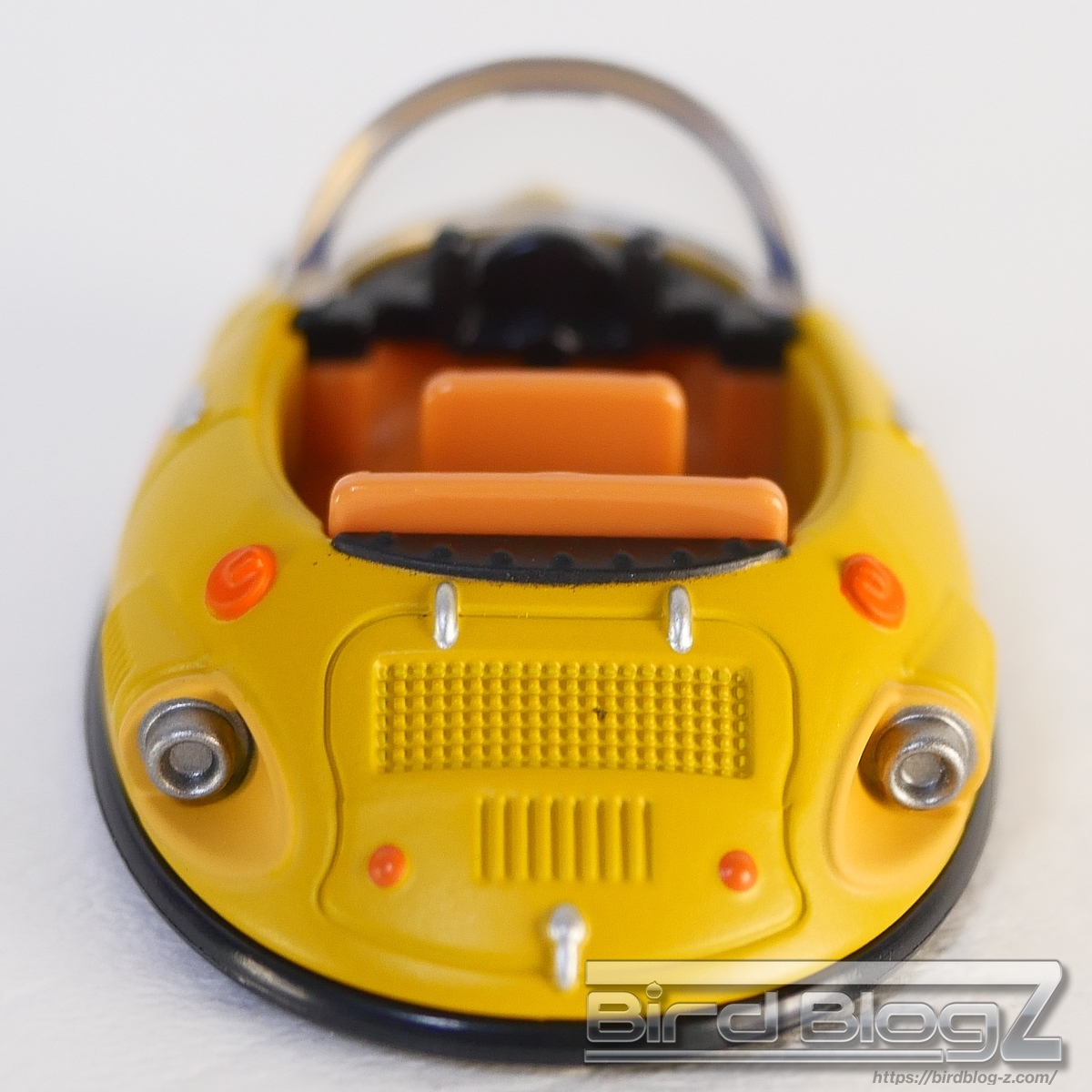 原作ではエアカーですが車輪が付き走らせることが可能です。内装シート3人乗りで運転席はハンドルやアクセルペダルやブレーキペダルかもしれないペダルも造形されています。ソフトトップが収納できそうなトランクのヒンジやウインカーまで彩色されています。