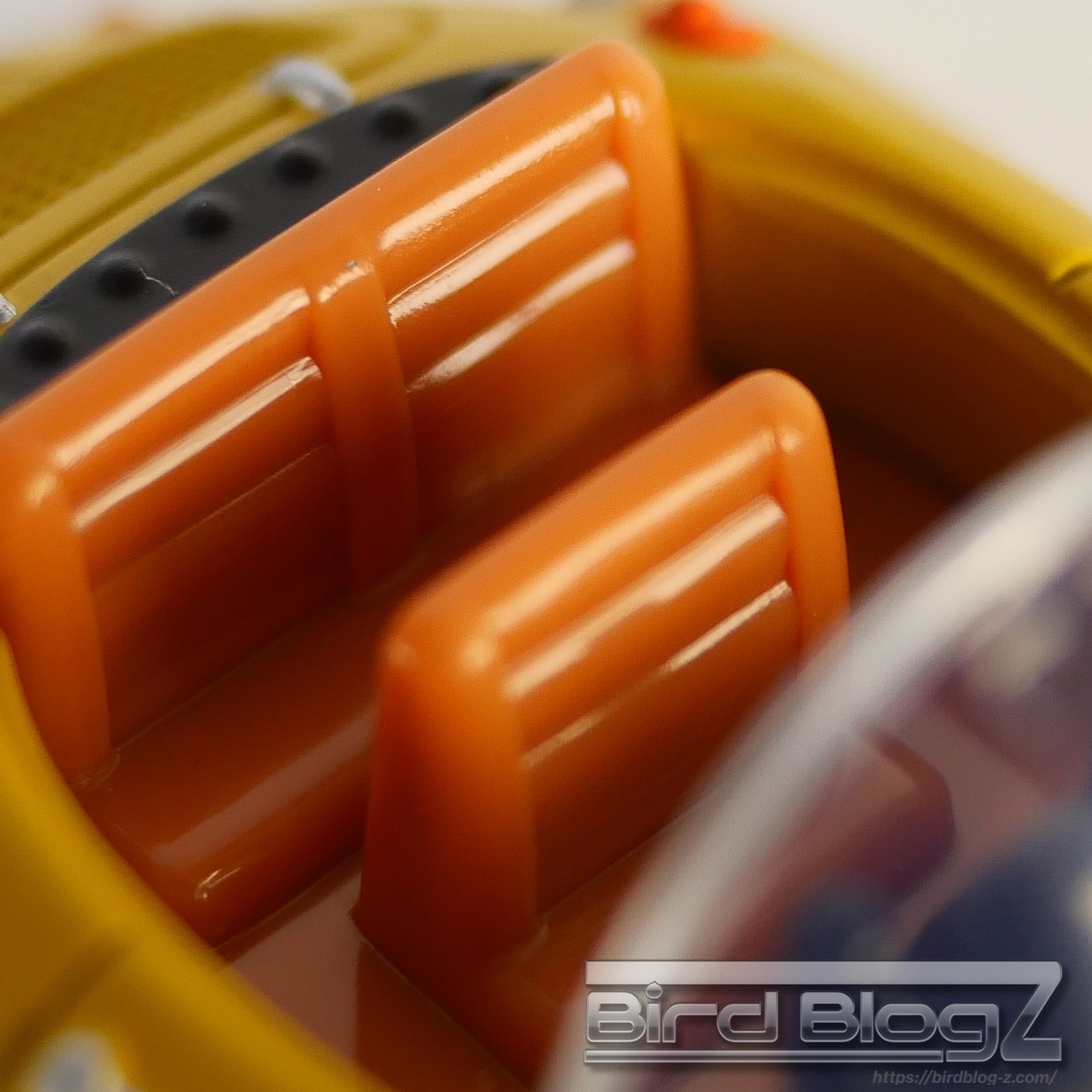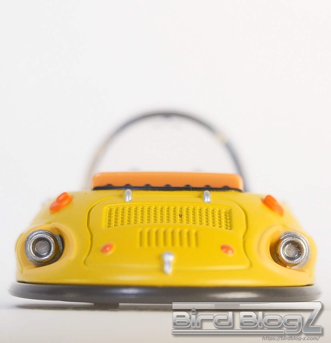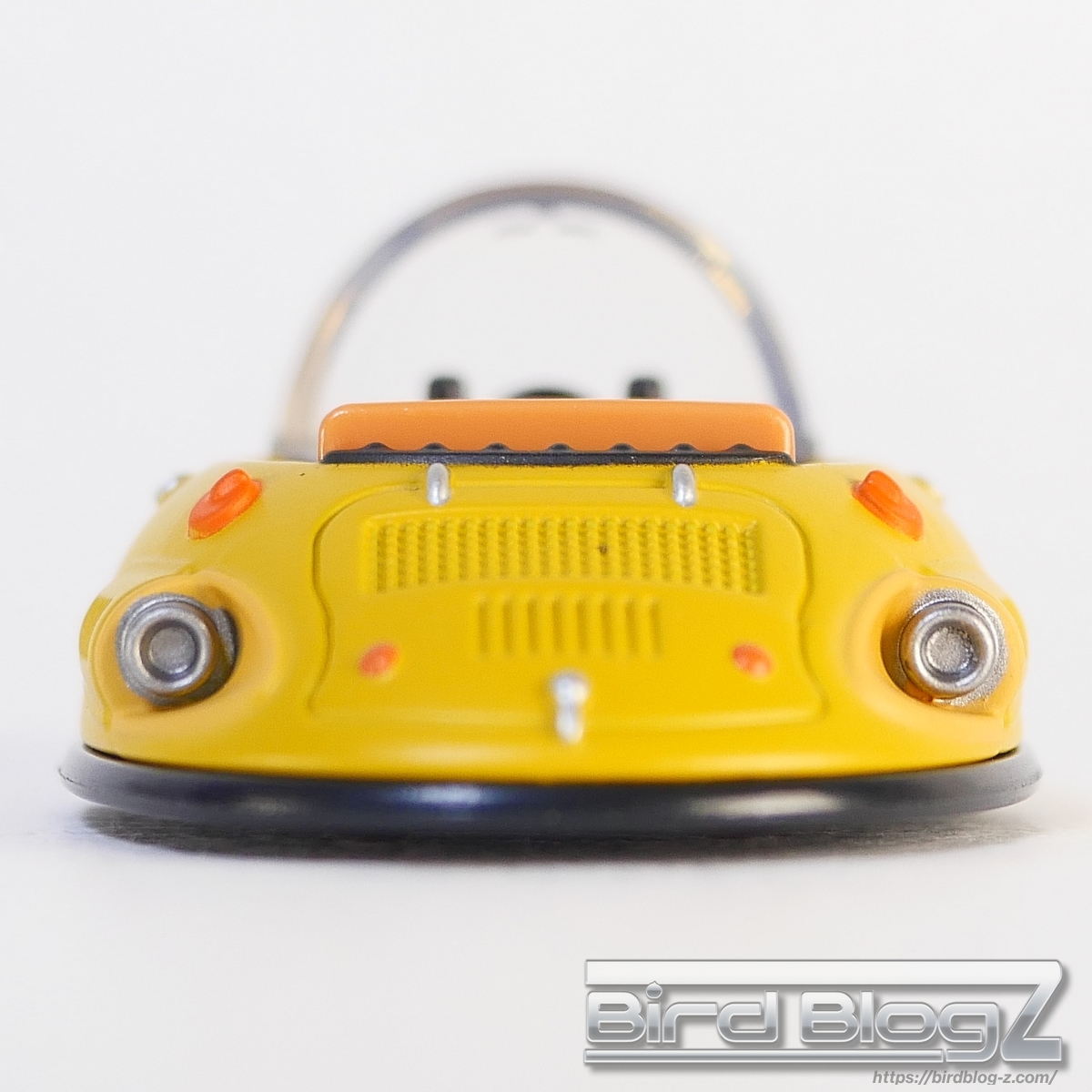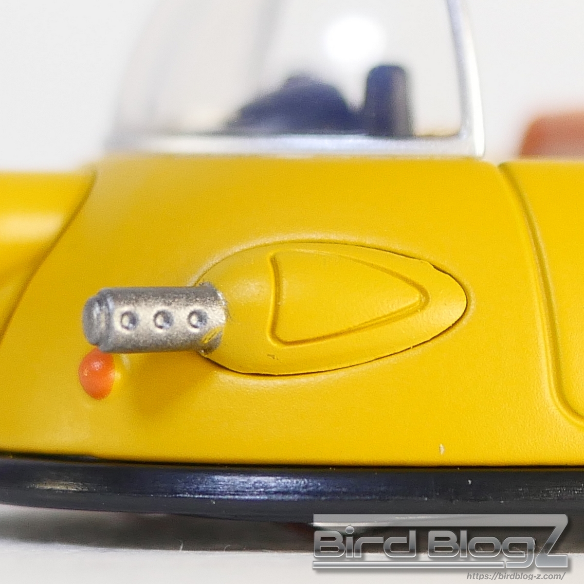 原作ではエアカーですが車輪が付き走らせることが可能です。内装シート3人乗りで運転席はハンドルやアクセルペダルやブレーキペダルかもしれないペダルも造形されています。ソフトトップが収納できそうなトランクのヒンジやウインカーまで彩色されています。