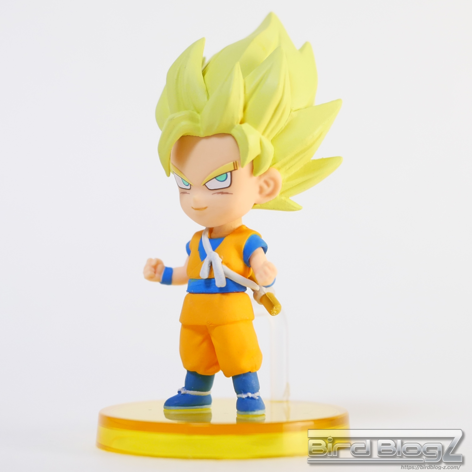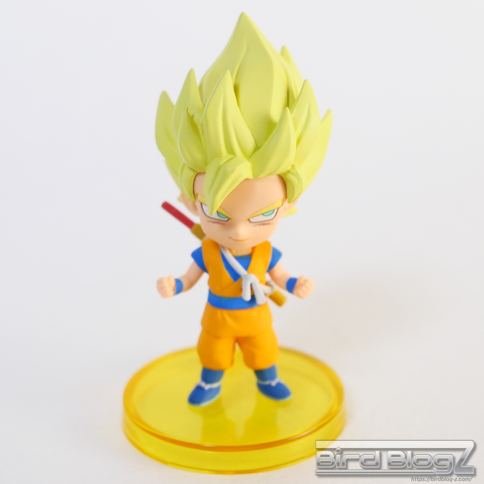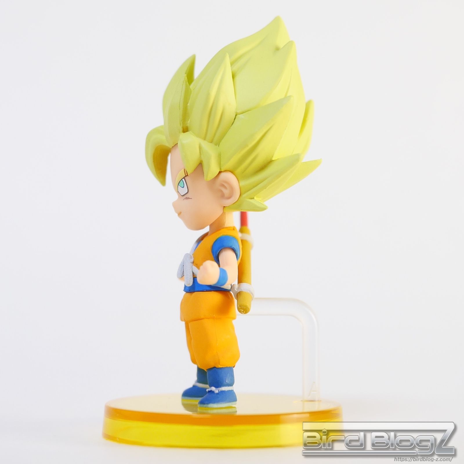 顎を引き上目遣いで自信があるような表情。身体はスリムですっきりしたフォルムに頭部が大きくディフォルメ感が高めです。通常時と比較すると髪が上に逆立つ勢いが強く、超サイヤ人2の雰囲気がしっかりと出ています。