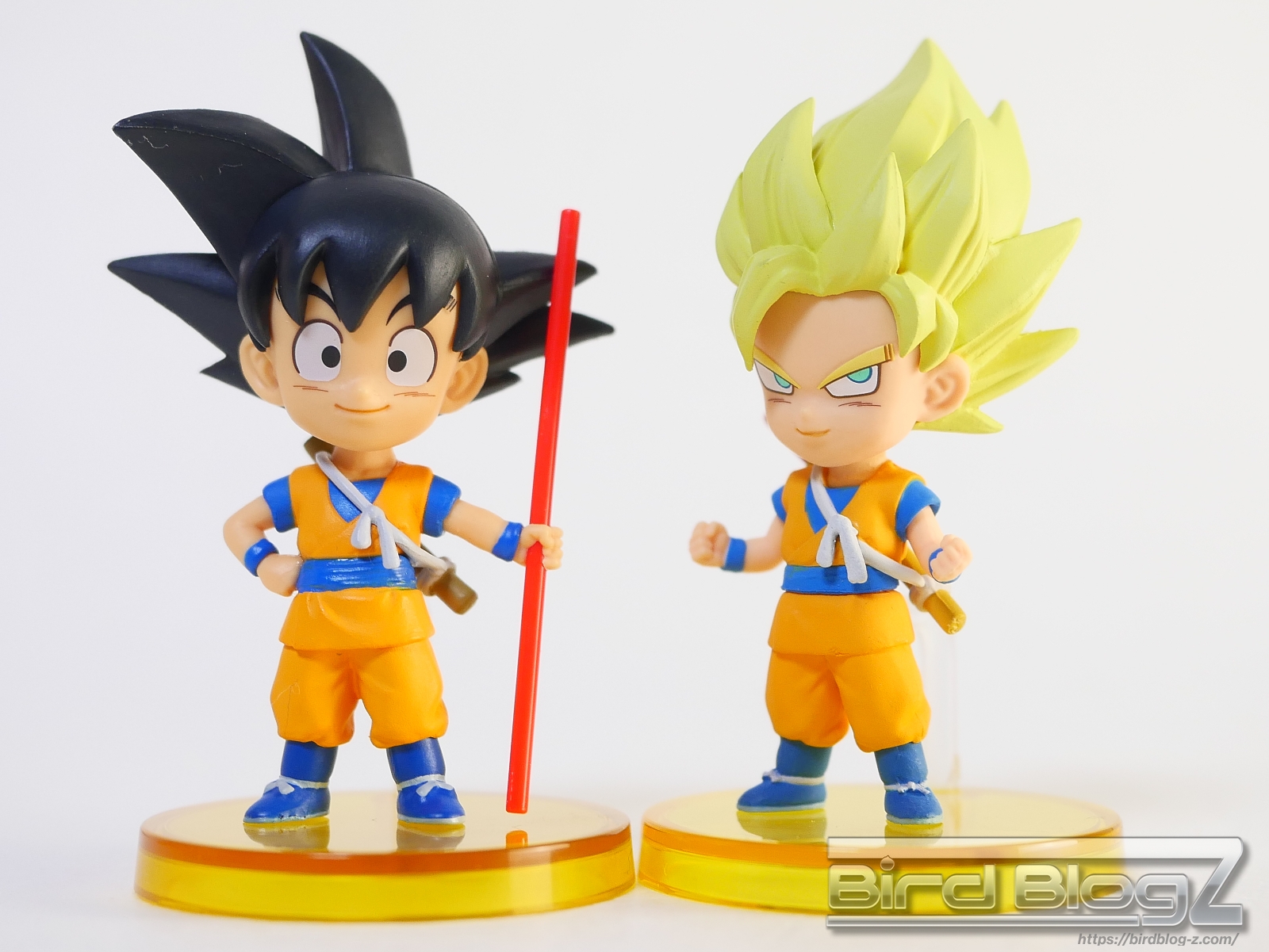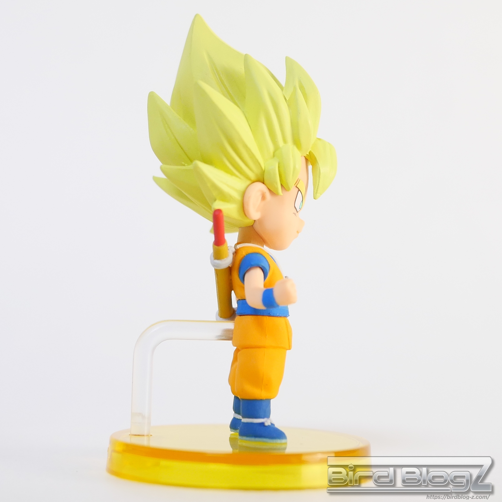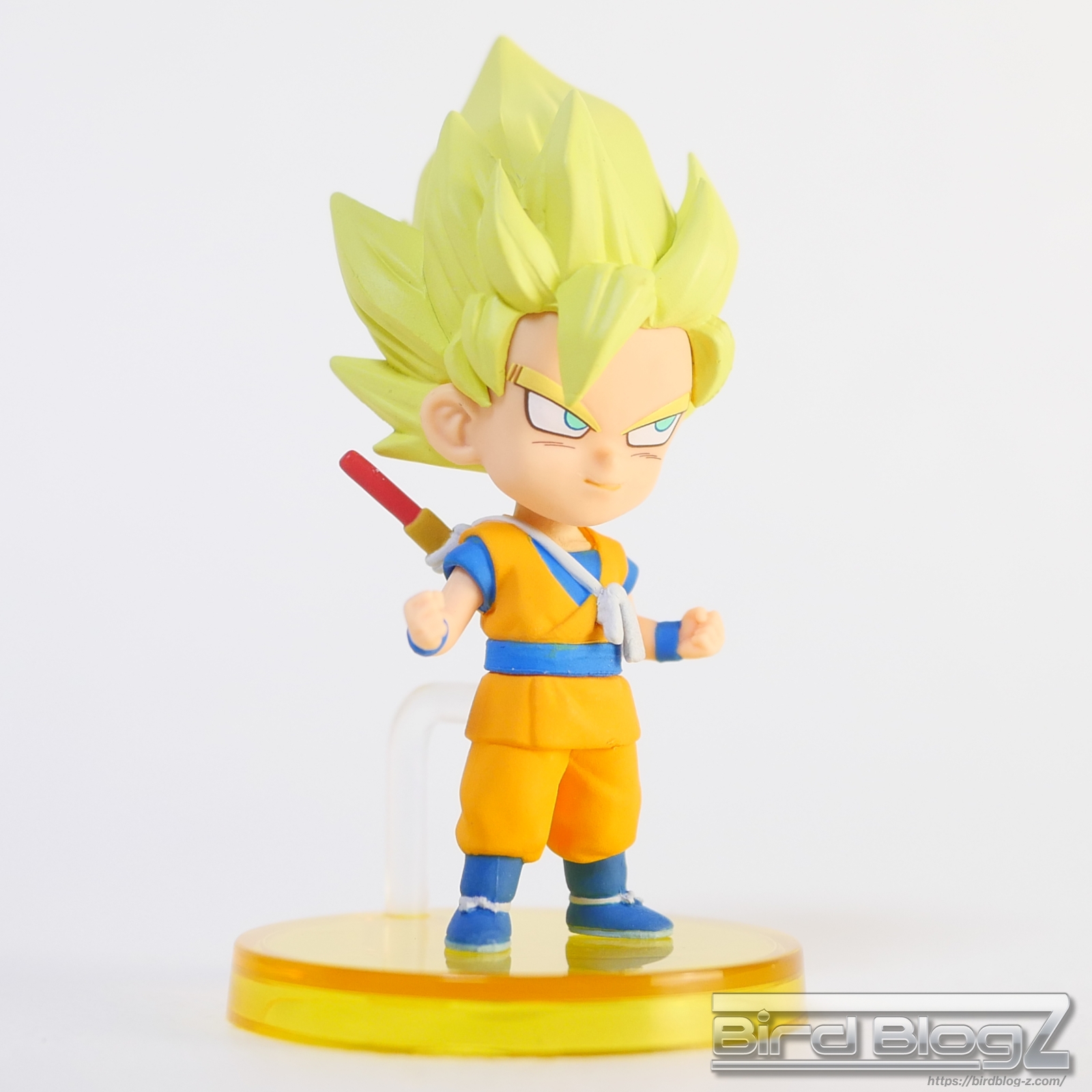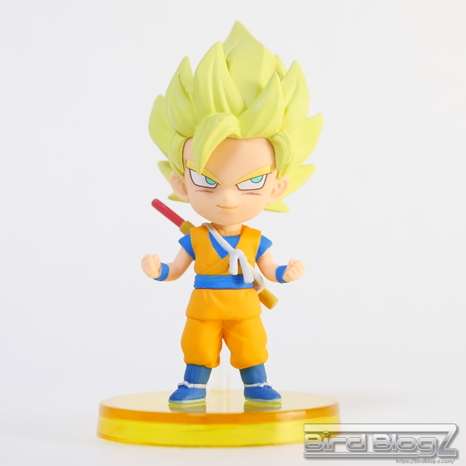 顎を引き上目遣いで自信があるような表情。身体はスリムですっきりしたフォルムに頭部が大きくディフォルメ感が高めです。通常時と比較すると髪が上に逆立つ勢いが強く、超サイヤ人2の雰囲気がしっかりと出ています。