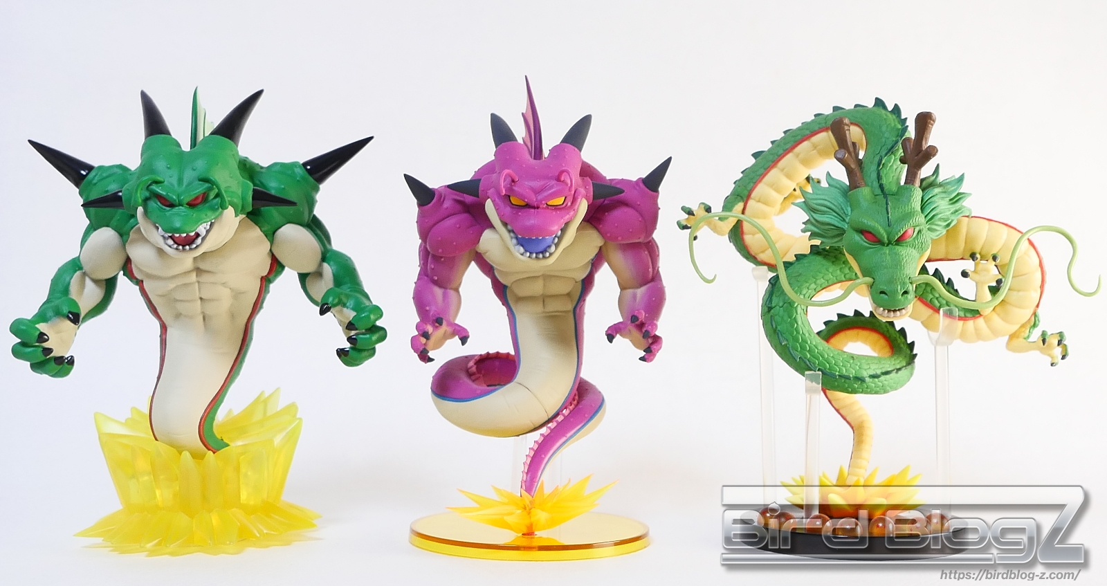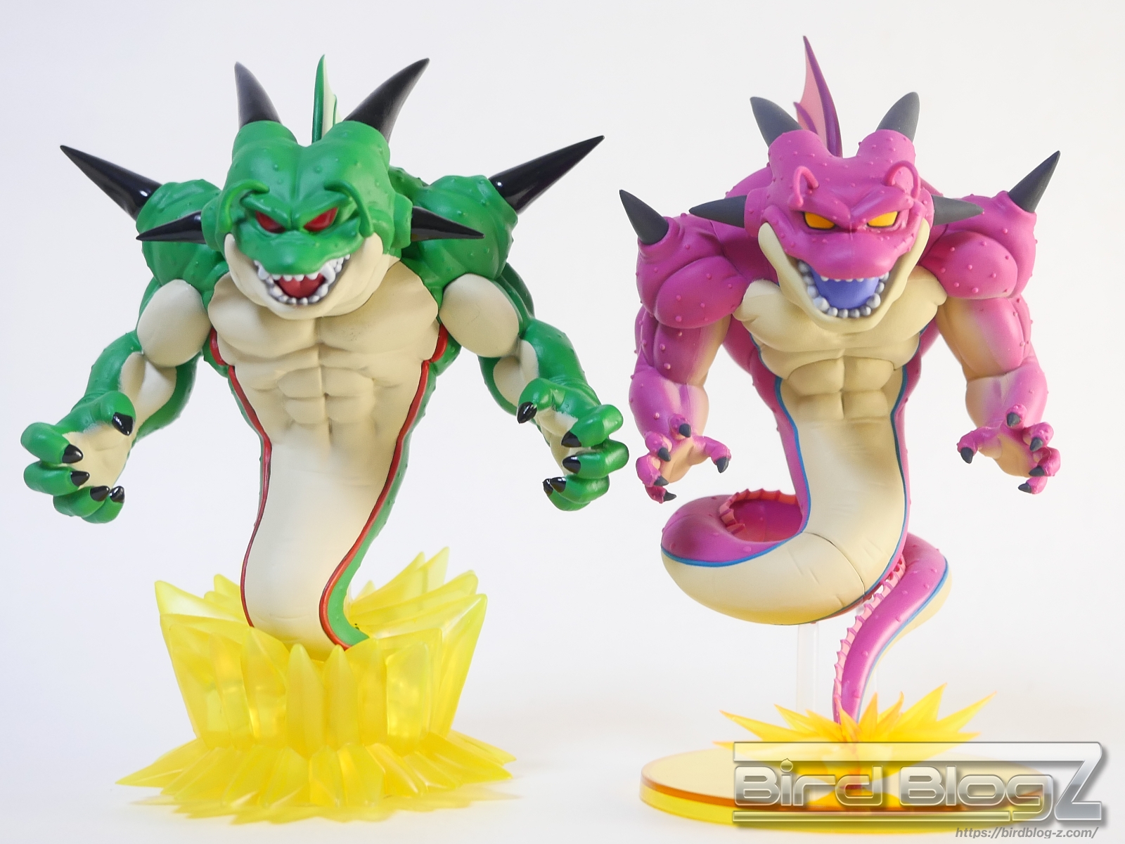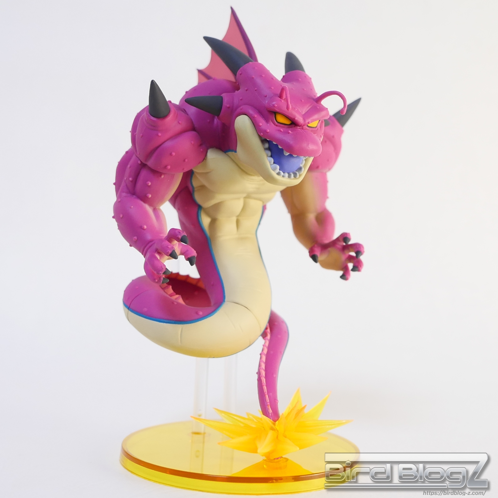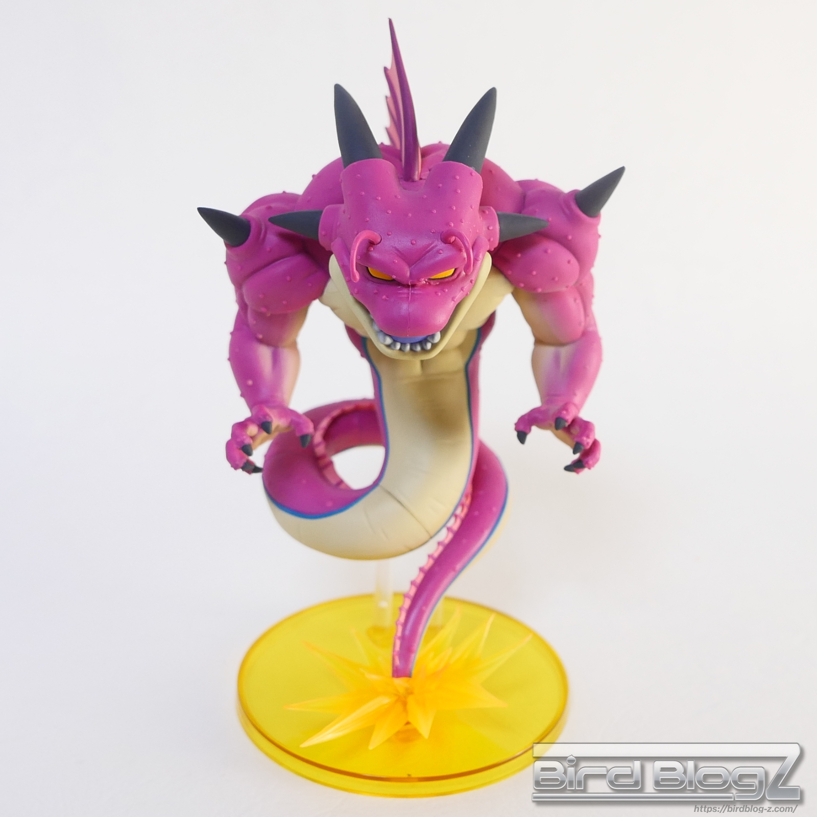 角が短くやや丸みがあり鼻先も丸みがあります。腕の内側と外側でグラデーション彩色があります。MEGAワーコレ神龍とアドバージポルンガ、DAIMAポルンガを並べると同サイズです。アドバージポルンガと並べるとDAIMAポルンガはすっきりとしたフォルムになっていることがわかります。